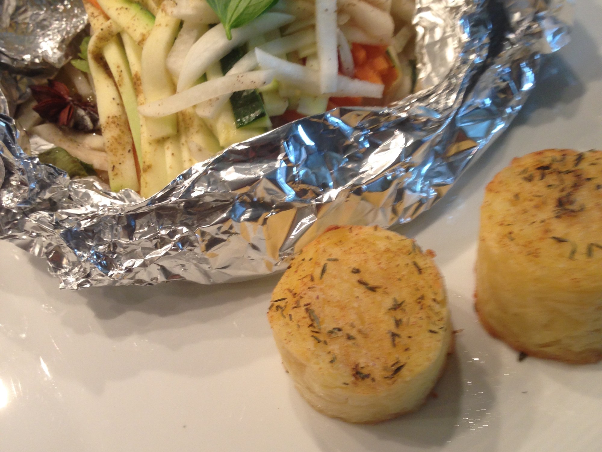1 7 april 2017 Papillot met kabeljauw loins met wortel, courget, meiraapjes met steranijs en komijn vergezeld van aardappelgratin