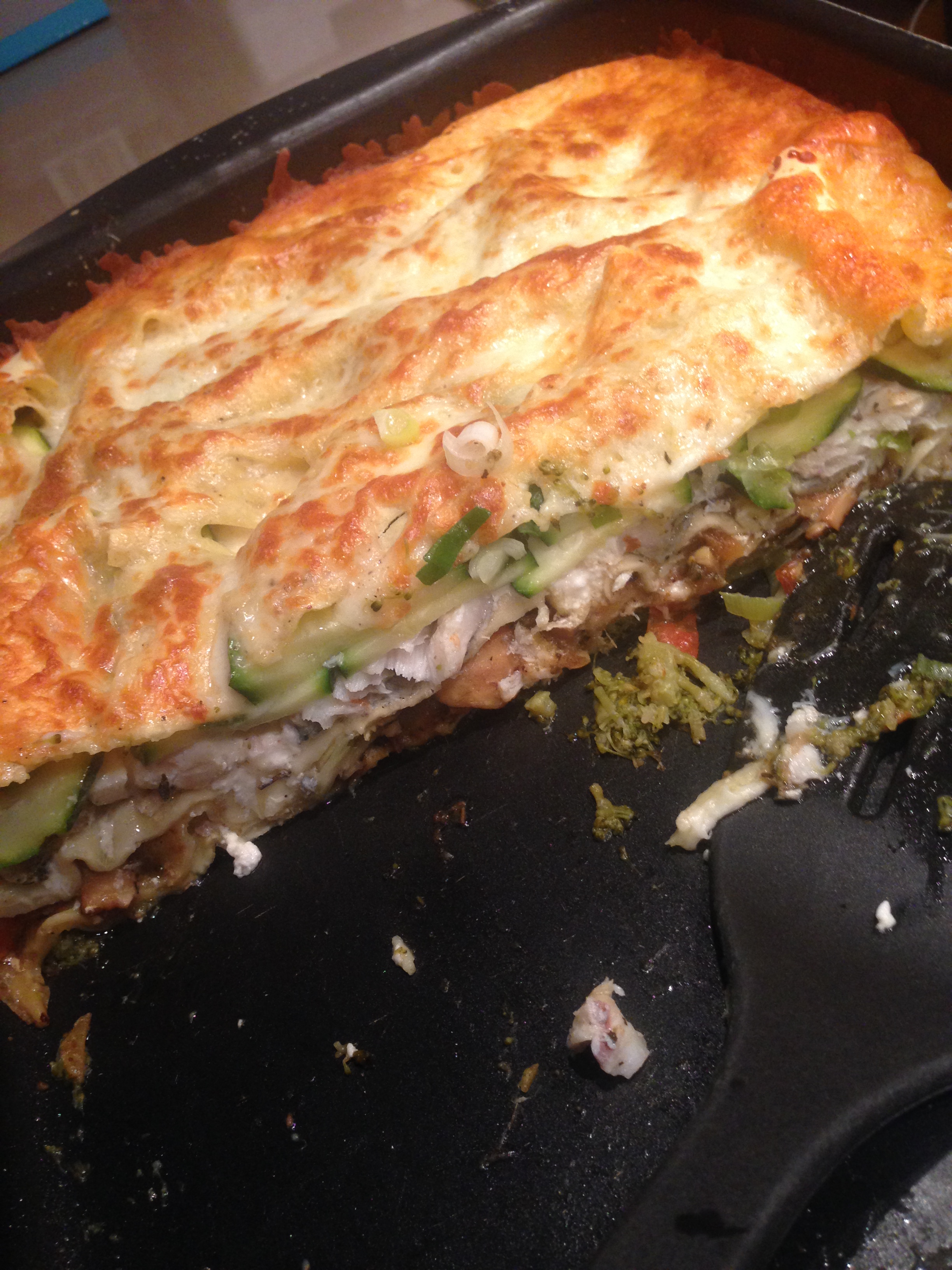 schelvis, lasagne, broccoli, courgette