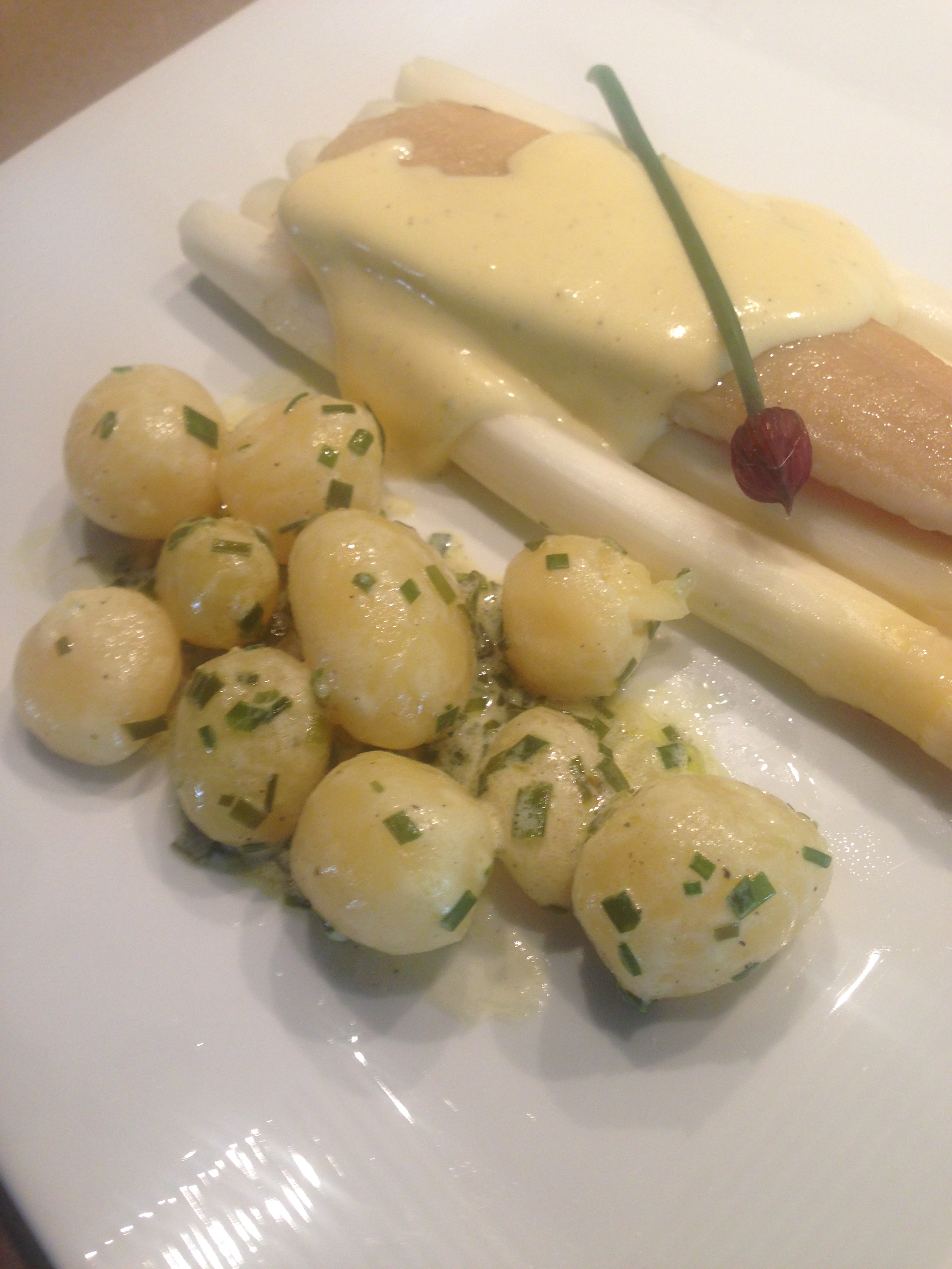 Asperges, gerookte Heilbot, krielaardappeltjes