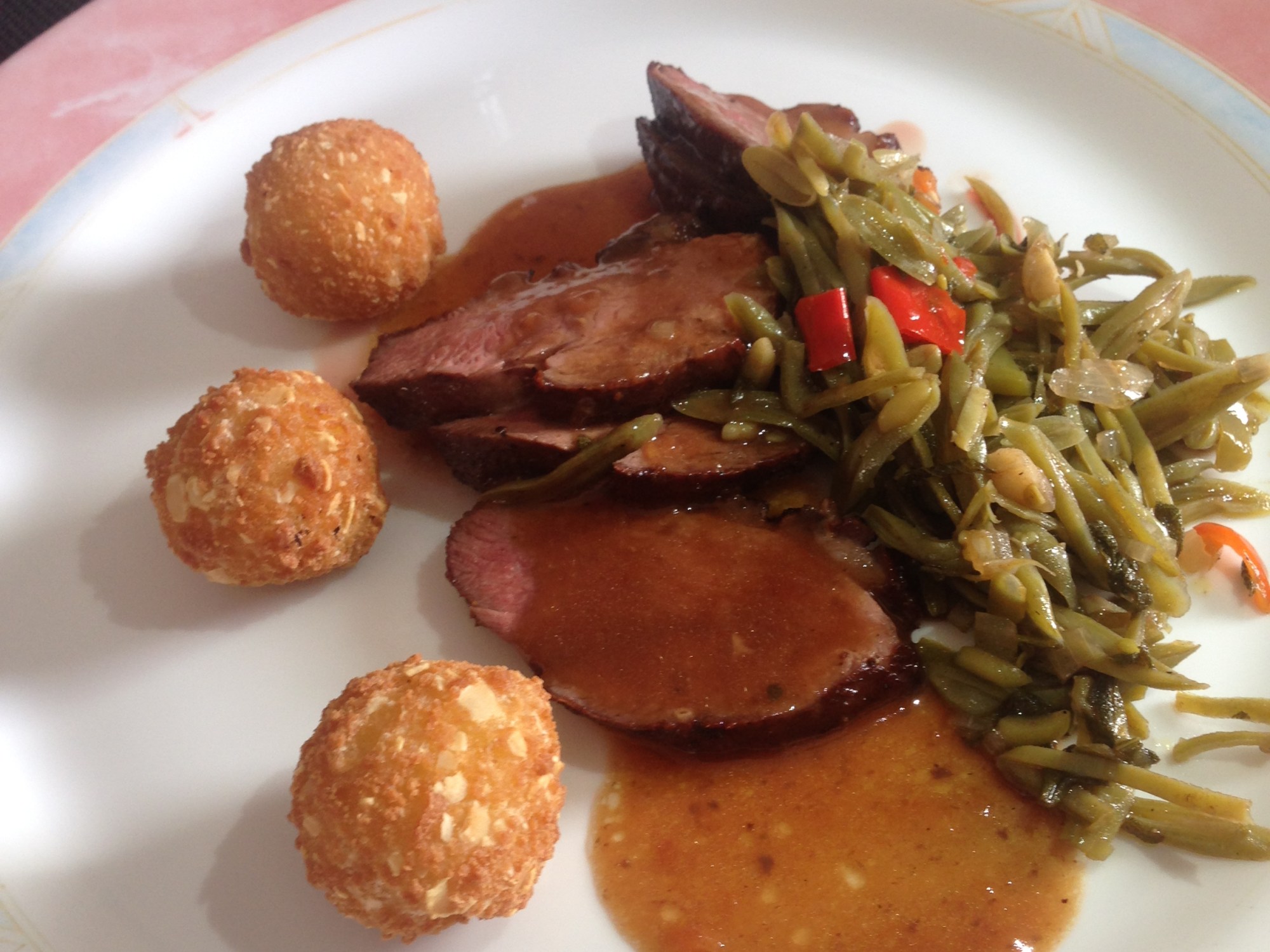27 november 2016 : gegrilde eendenborstfilet met sinaasappel port saus met salieboontjes en amandelkroketjes