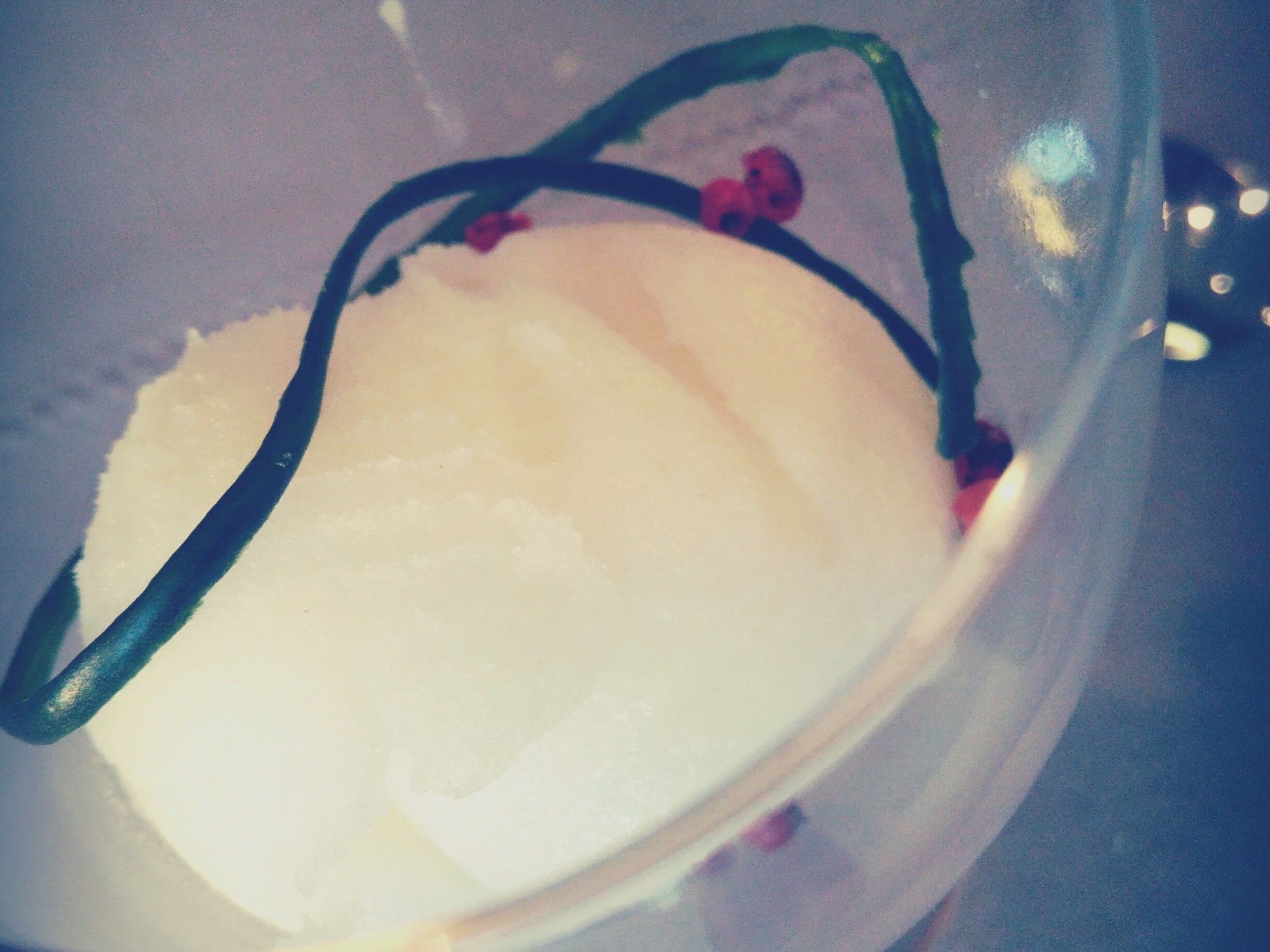 Een speciale kleine ijsbollenschepper gekocht voor deze sorbet: 3 kleine bolletjes per glas…maar ééntje kan natuurlijk ook.