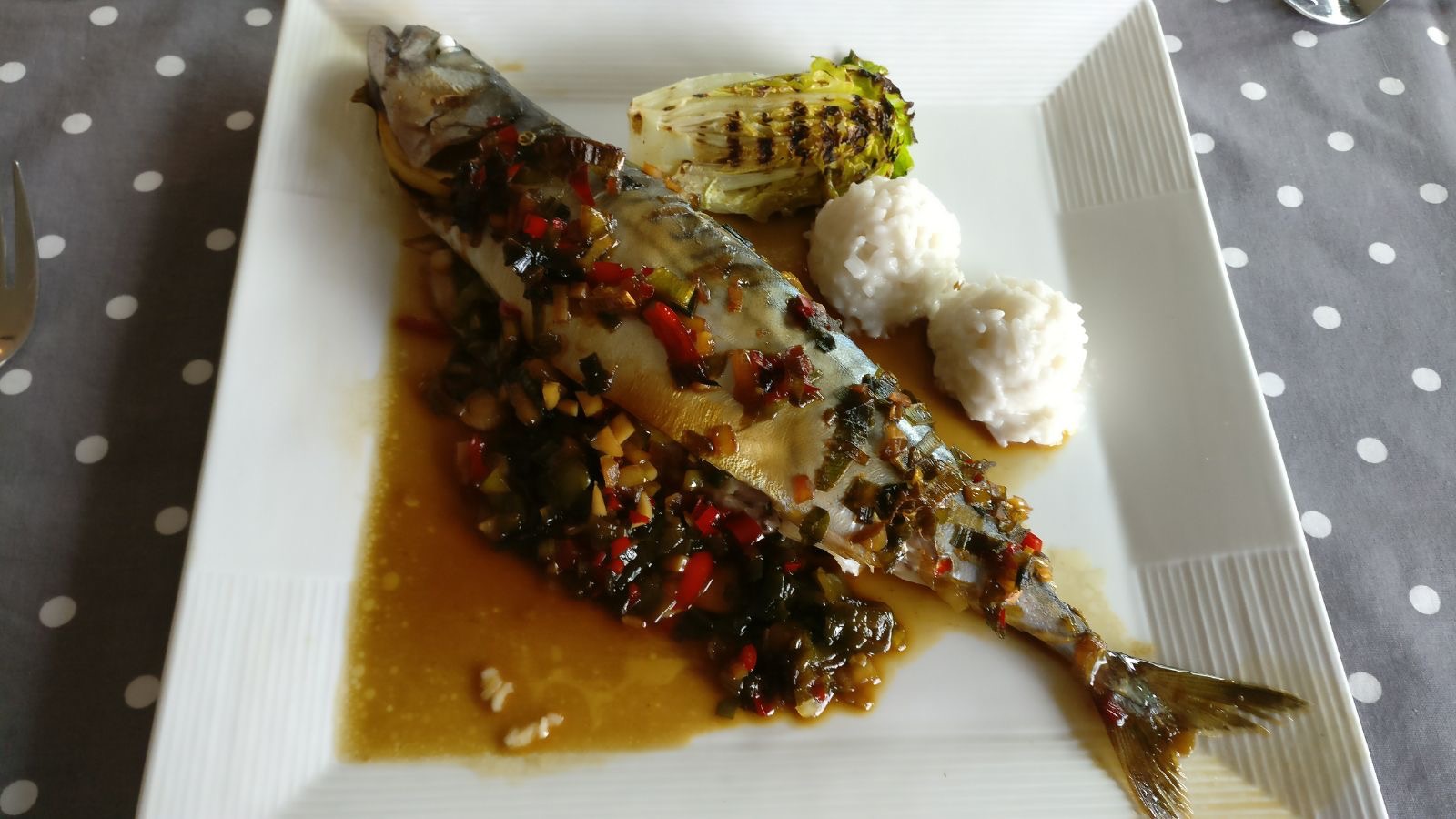 Makreel, kokosrijst, suikersla