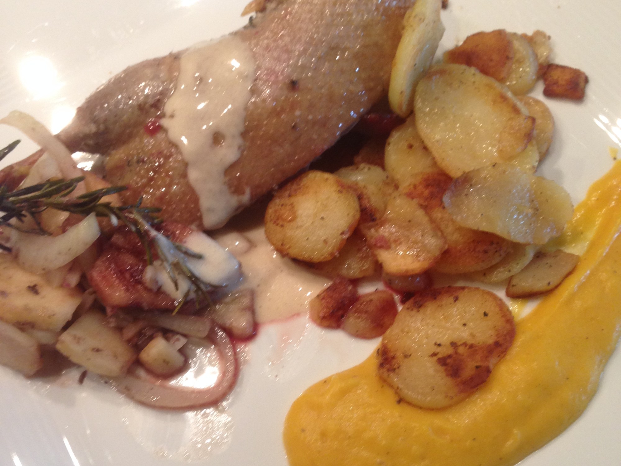Schieteend met rozemarijn in eigen jus, appeltjes, pompoenmousse en gebakken aardappelen