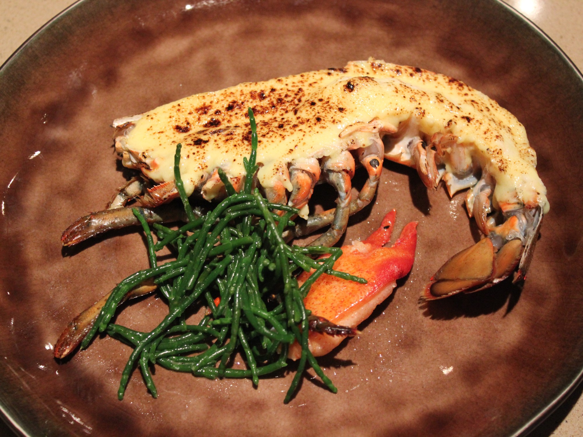 Gegratineerde halve kreeft met gruyèrekaas en zeekraal