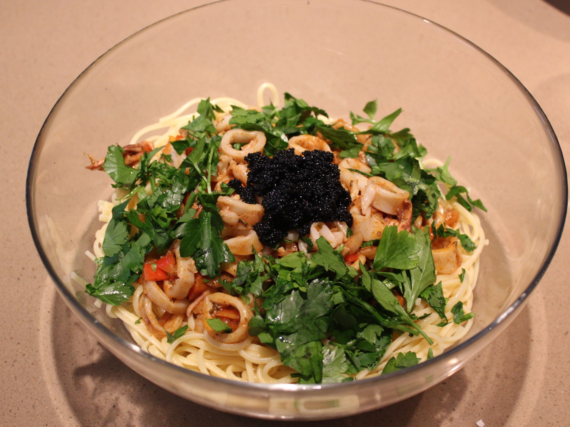 De inktvis in een groentebouillon 25 minuten lichtjes laten sudderen. Is een zeer goede tip! De fijn gesneden ajuin, lookteentjes, selder in wat olijfolie aanzetten in pan. Daarna de fijngesneden zoete paprika erbij samen met het paprikapoeder, de chili-vlokjes en pilipili en de fijn gemalen rozemarijn. De gekookte inktvis in reepjes snijden en toevoegen aan de saus. Eventueel nog wat op smaak brengen met pezo en dan dresseren op de gekookte linguine. Ruim met platte peterselie bestrooien en tot slot nog wat lompviseitjes.
