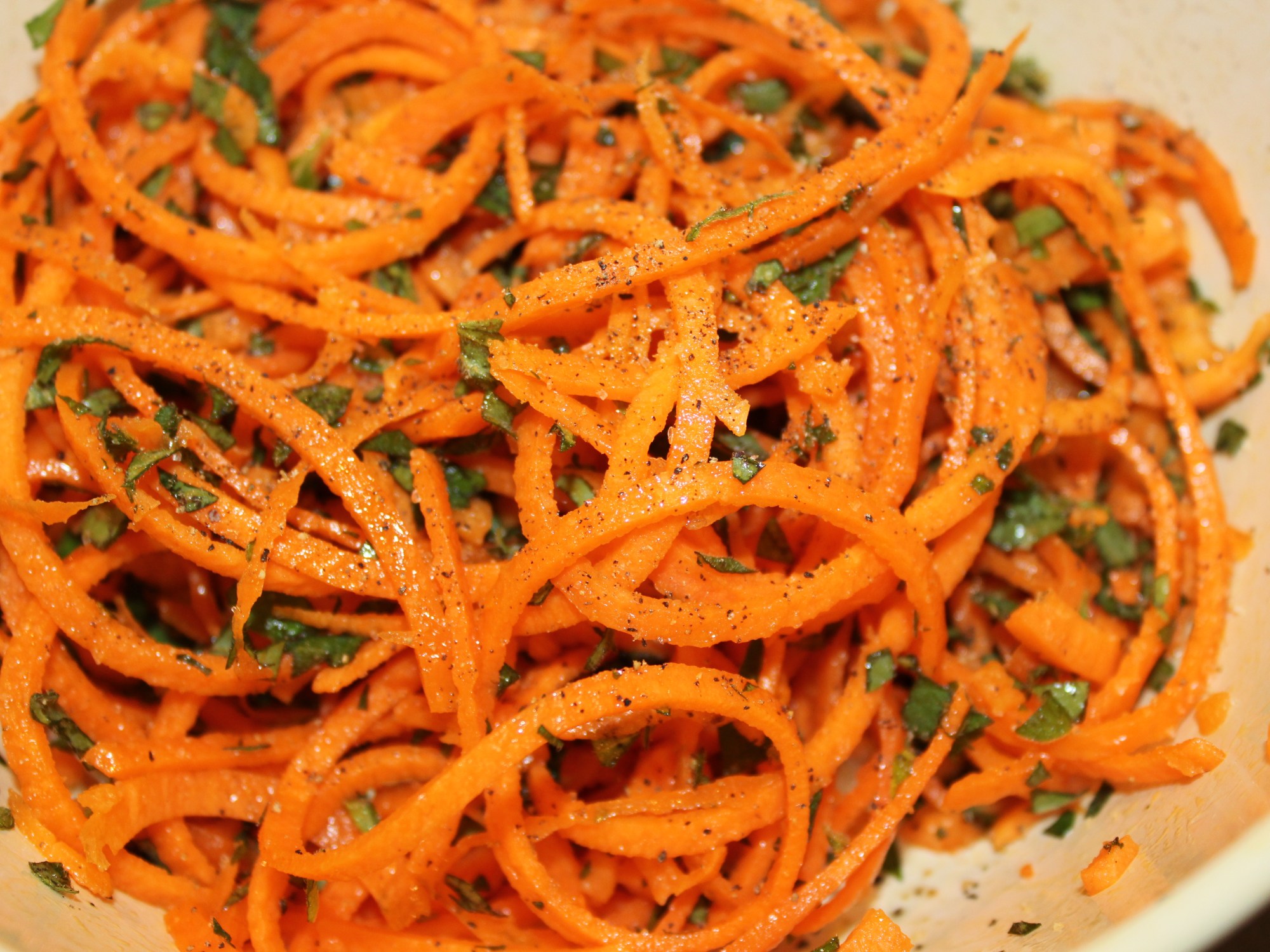 Met spiraalsnijder gesneden worteltje met gesnipperde verse oregano en olijfolie