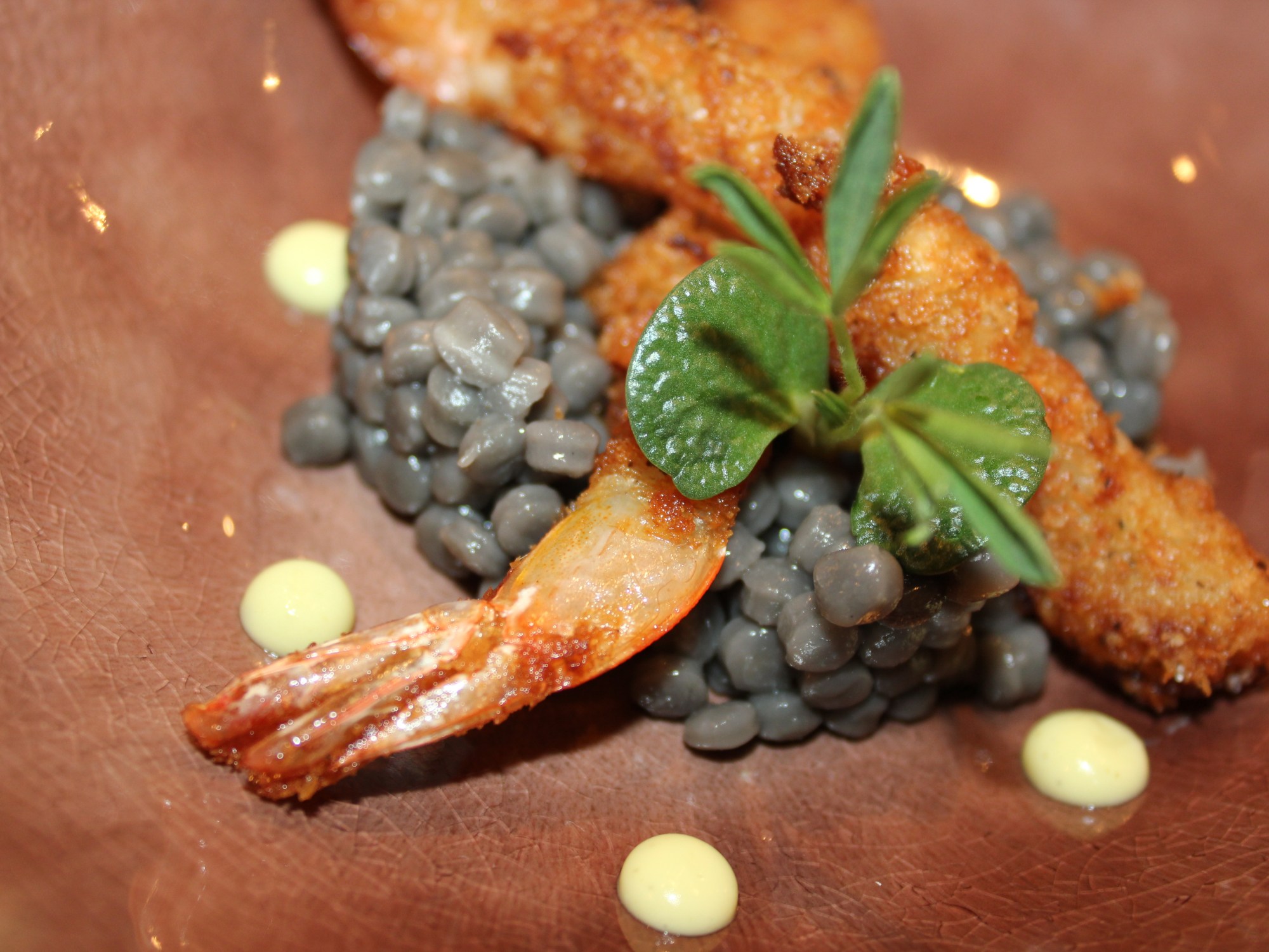 Nobashi garnalen met fregola nero en een kruidenmayonaise