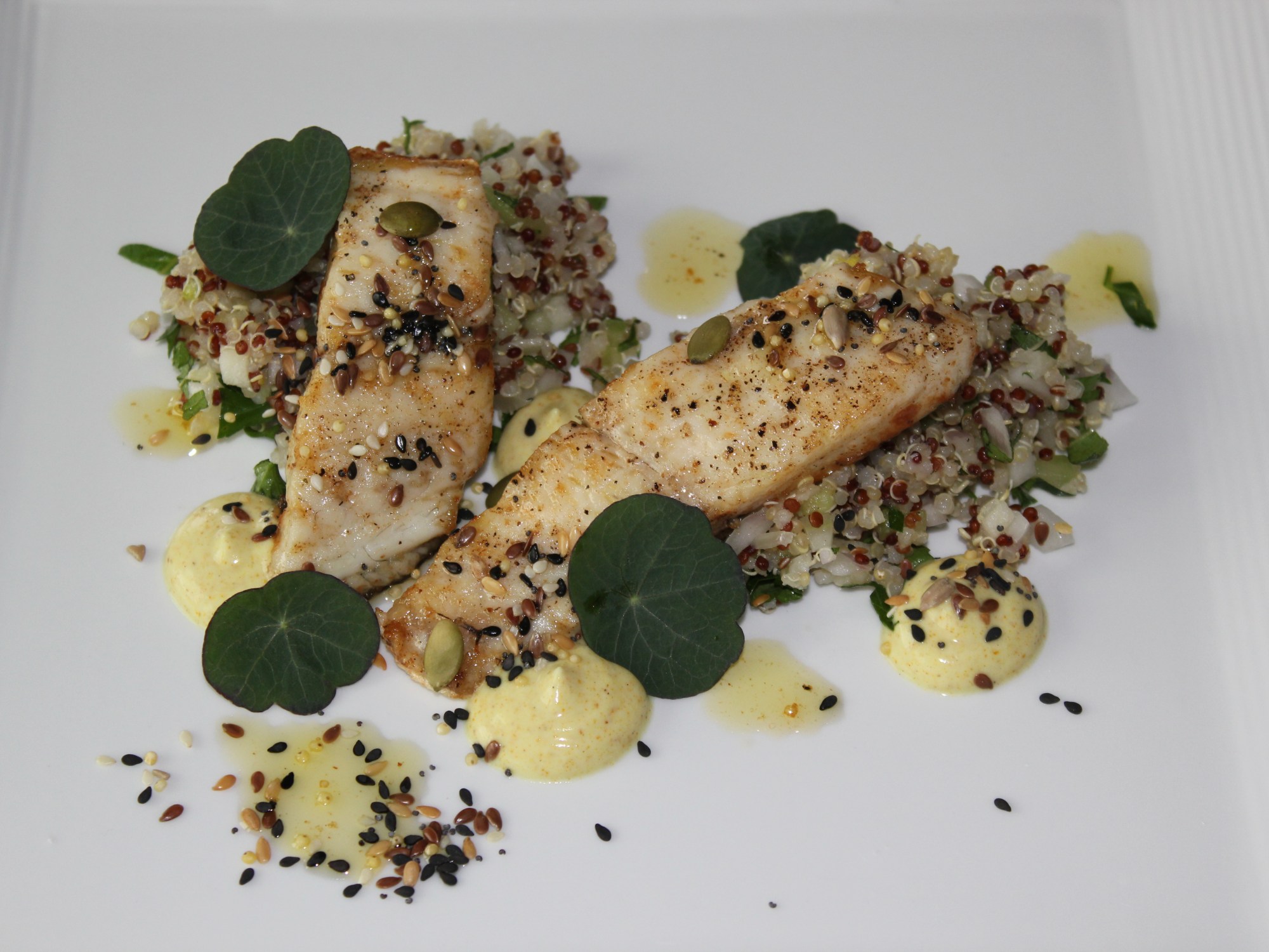 Doradefilet met salade van quinoa, venkel, komkommer, appel, sjalot met een kerrie-plattekaassausje vergezeld van diverse granen en kruiden