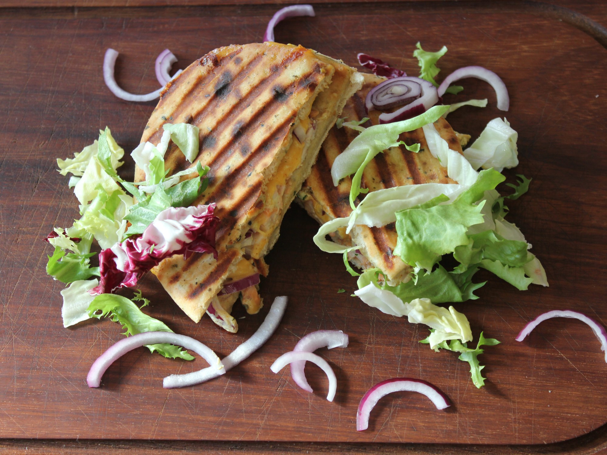 Naantosti met pulled chicken, rode ui, cheddar en een curry-yoghurtsausje