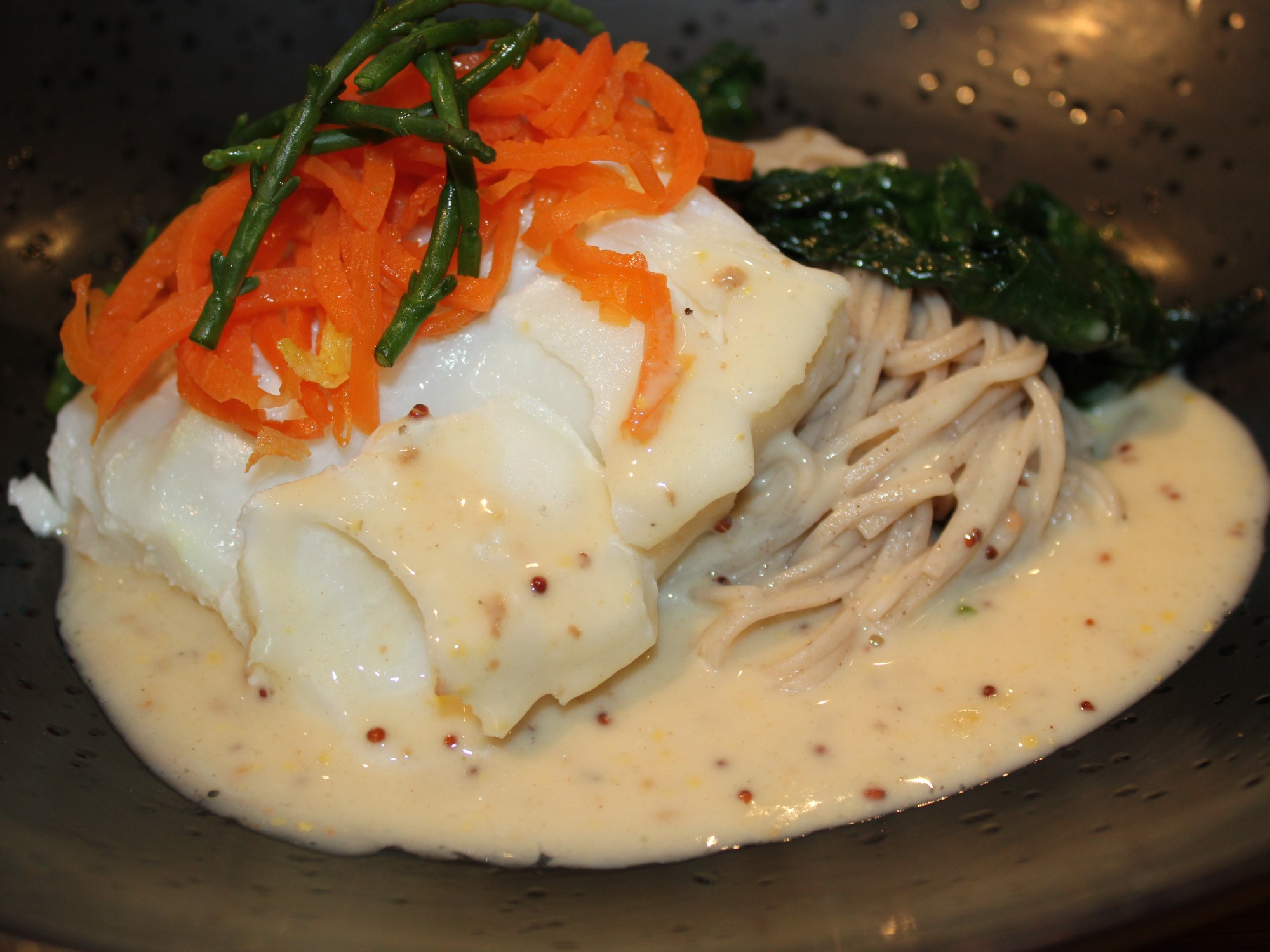 Skrei op z’n Thais uit de steamer met noedels, spinazie, worteltjes, zeekraal en een mosterdroomsausje