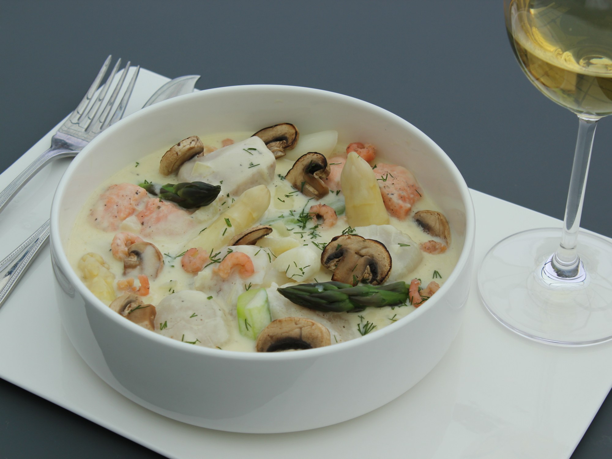 Bereiding is simpel. Ui met knoflook stoven en blussen met witte wijn. Room erbij. De asperges traditioneel beetgaar garen. Vis blancheren in de saus. Vis in een pannetje, opgewarmde asperges en champignons erbij. Saus binden en er overover dresseren. Met gehakte dille en garnaaltjes afwerken.