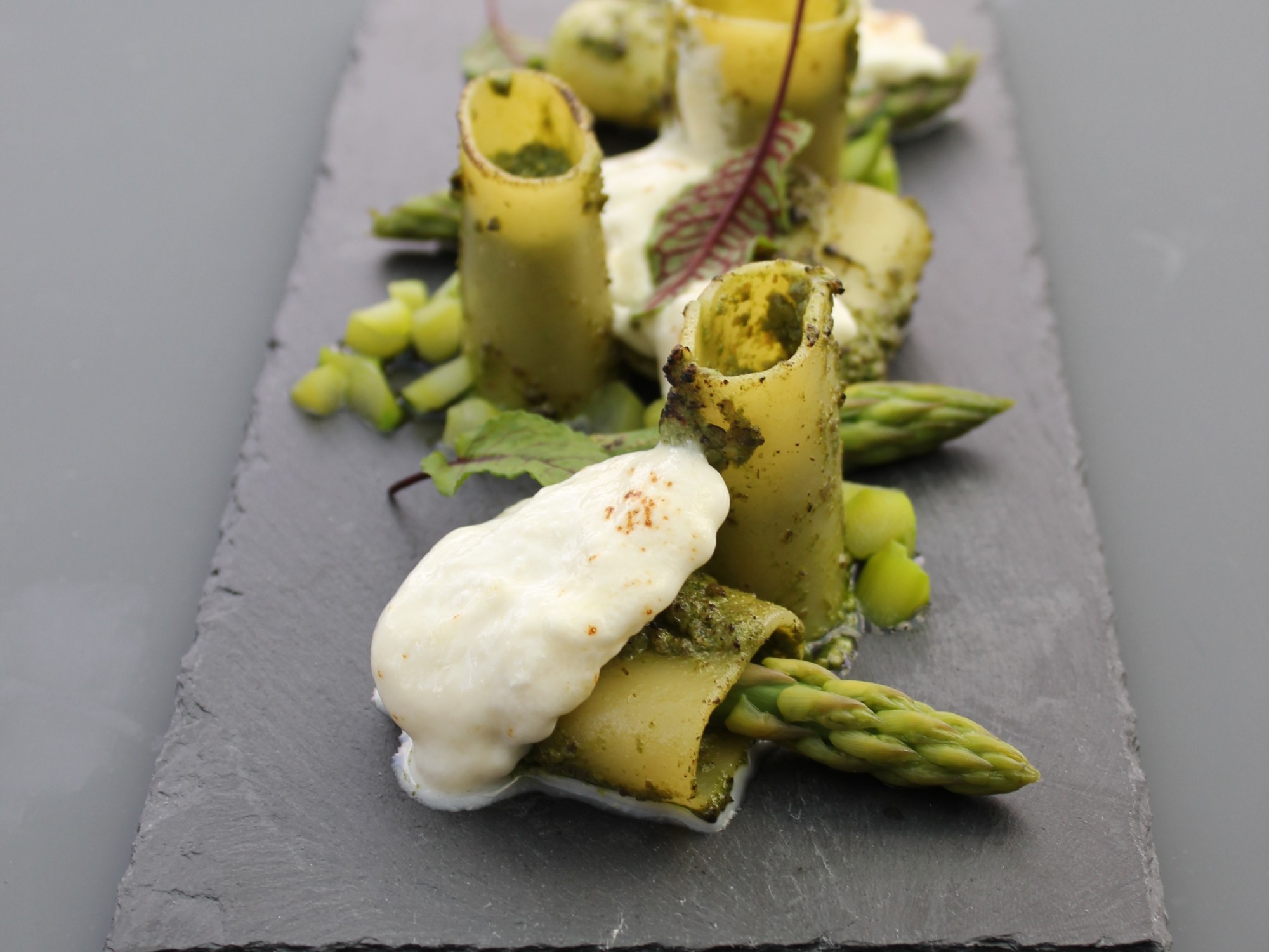 Pasta paccheri met burrata, groene asperges en een pesto met kruidenolie