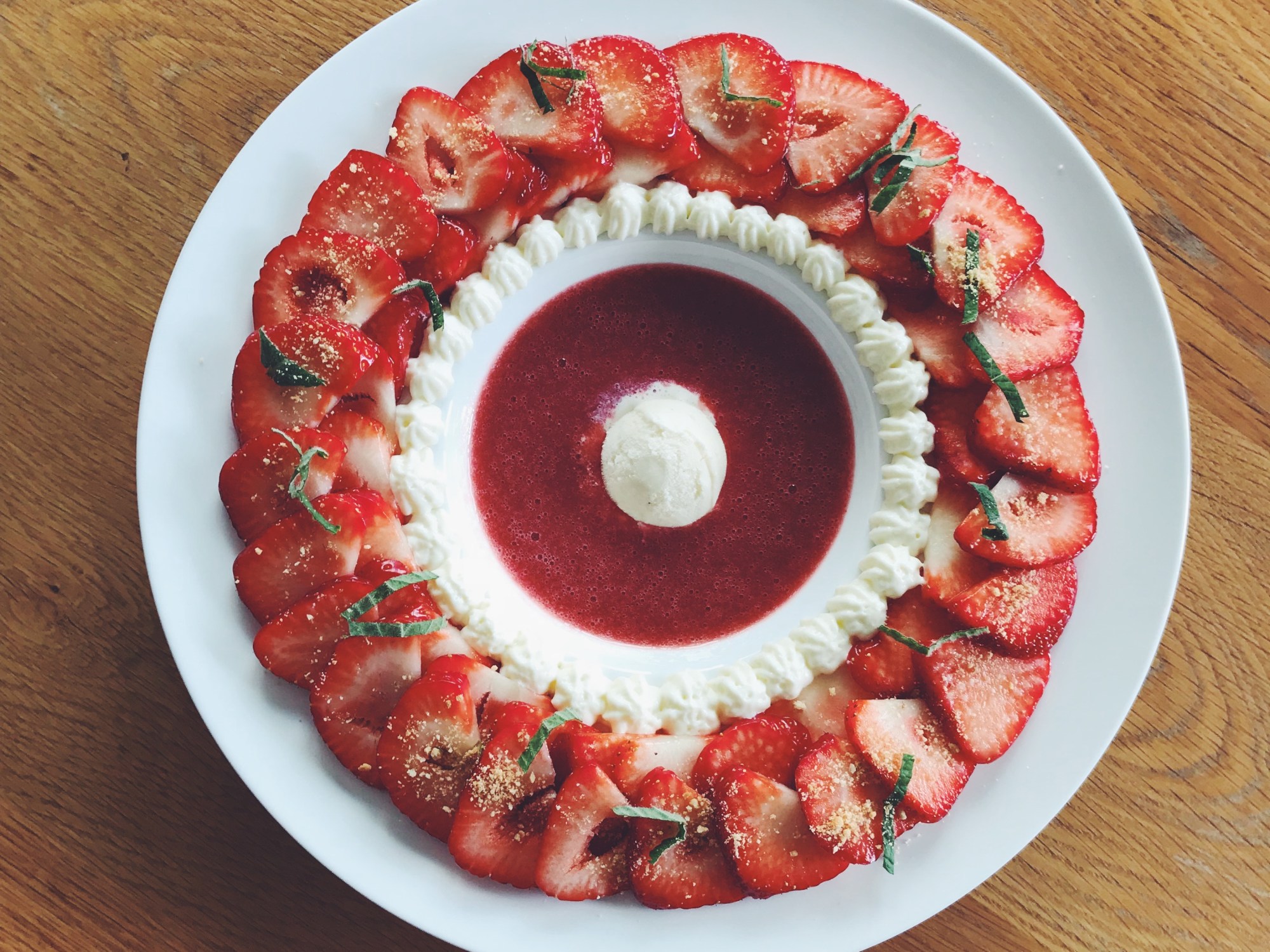 Aardbeiencarpaccio met coulis, ijs, munt, slagroom en een crumble van petit-beurre koekjes.