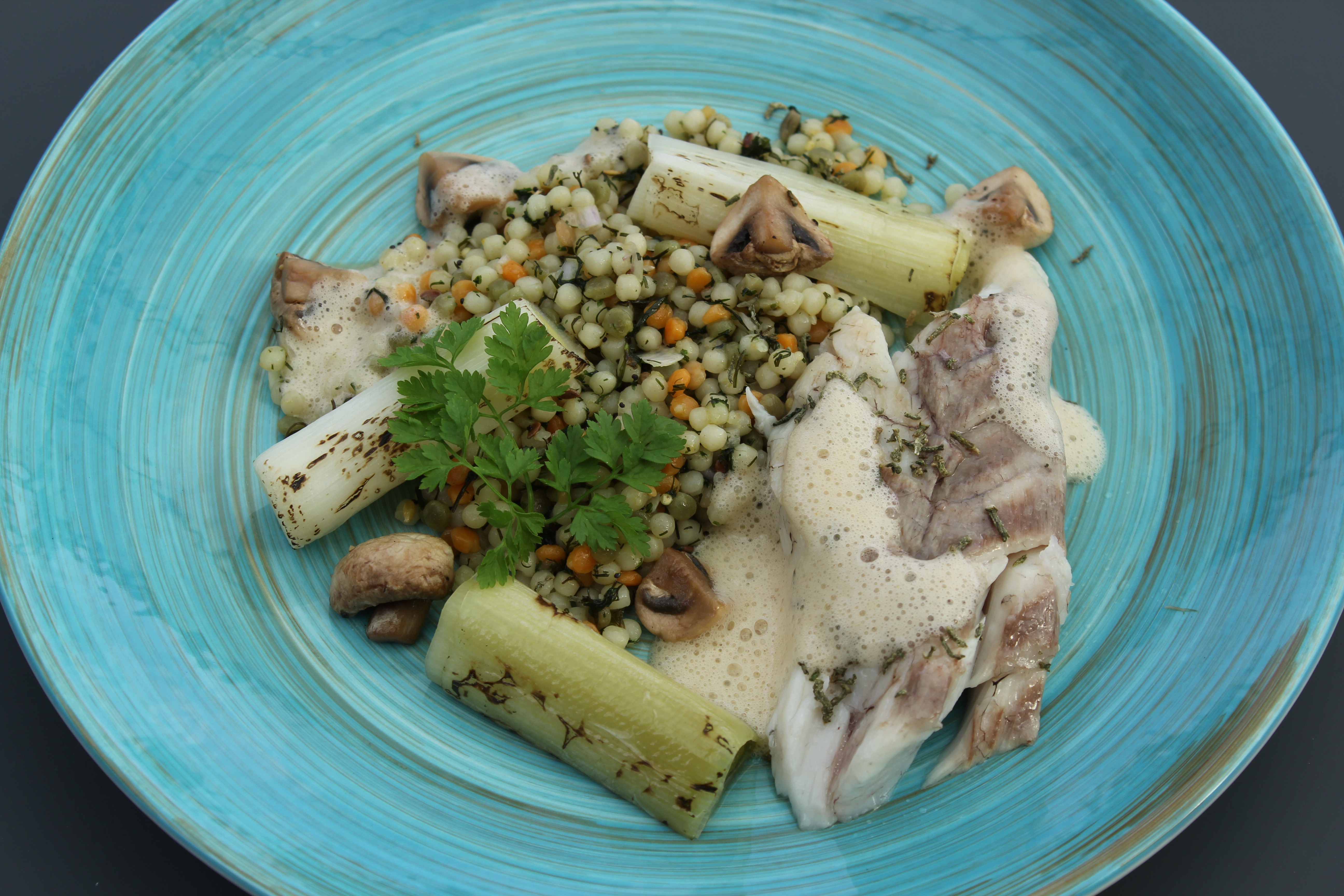 Corvina in zoutkorst, couscous, porei