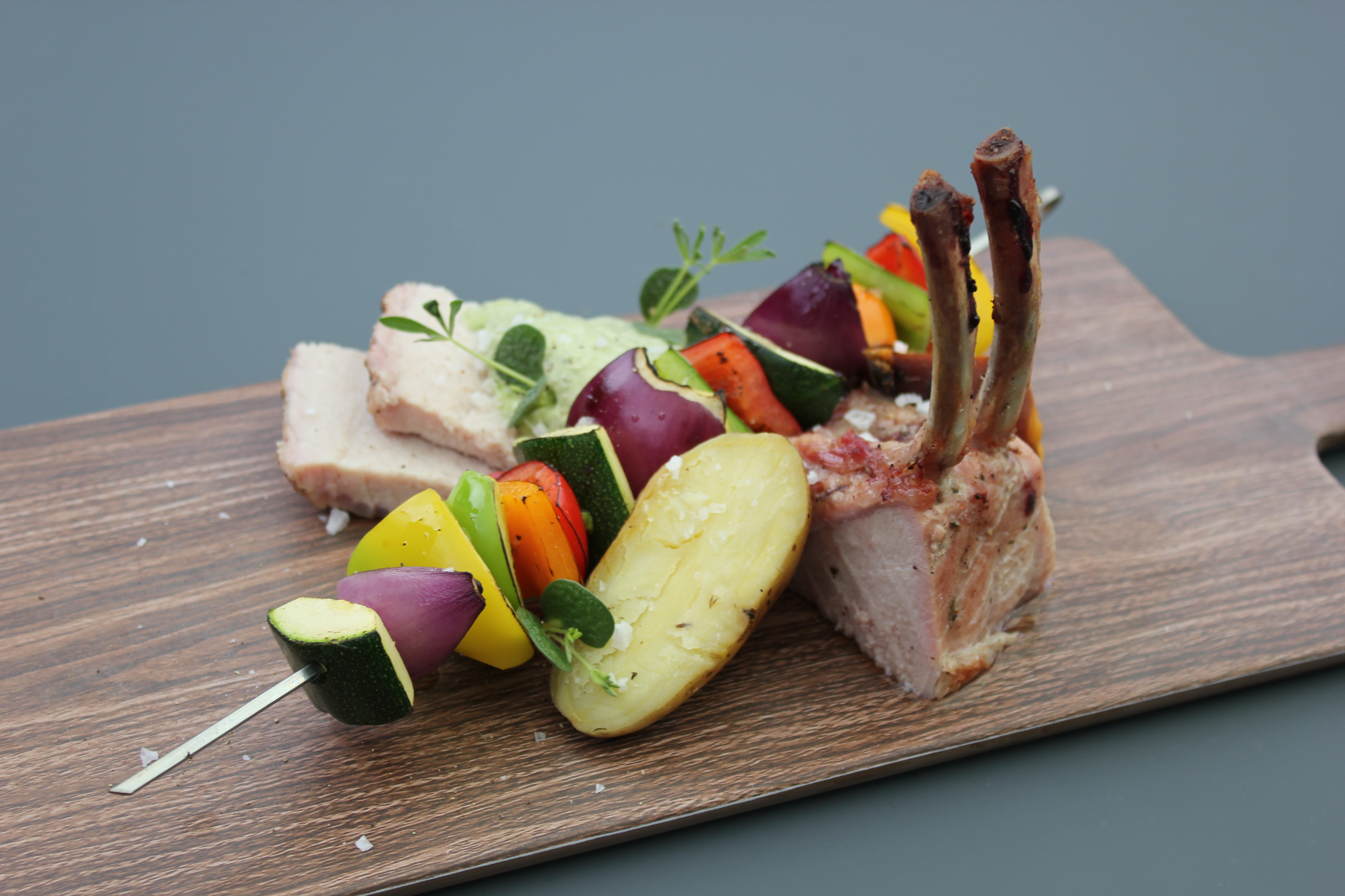Varkenskroon, groentespies, knoflook-peterselie mayonaise