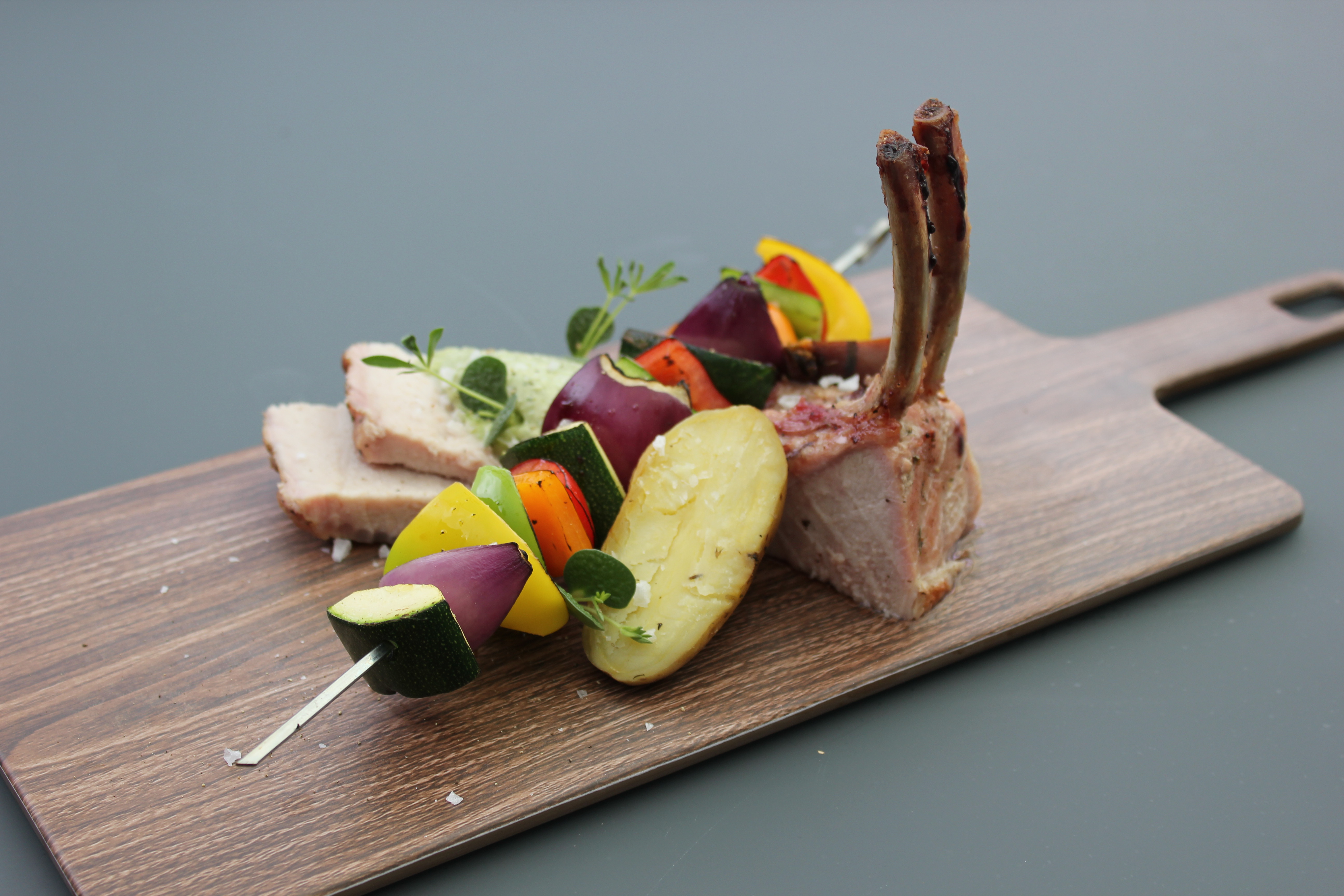 Varkenskroon, groentespies, knoflook-peterselie mayonaise