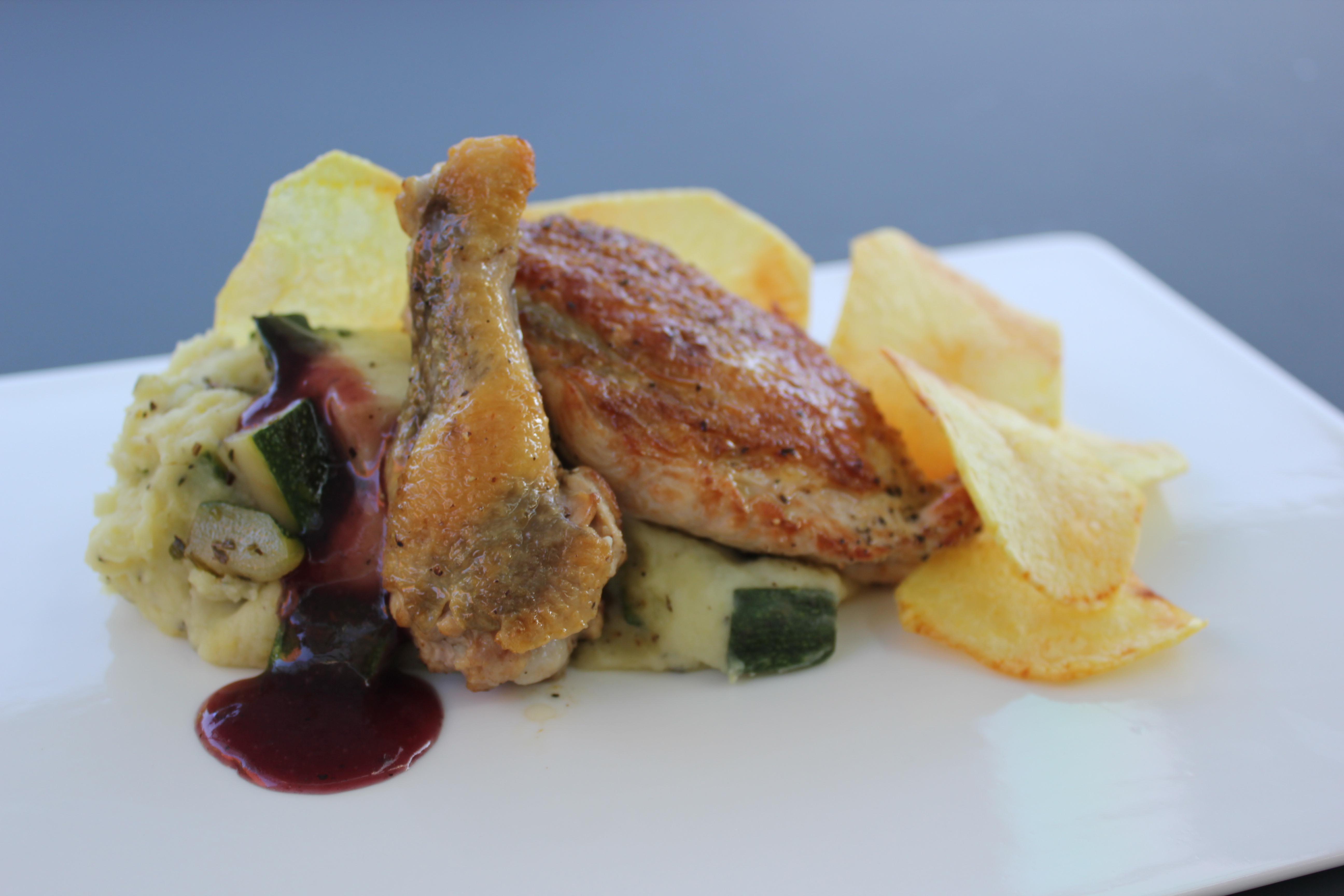 Parelhoen, puree, courgette