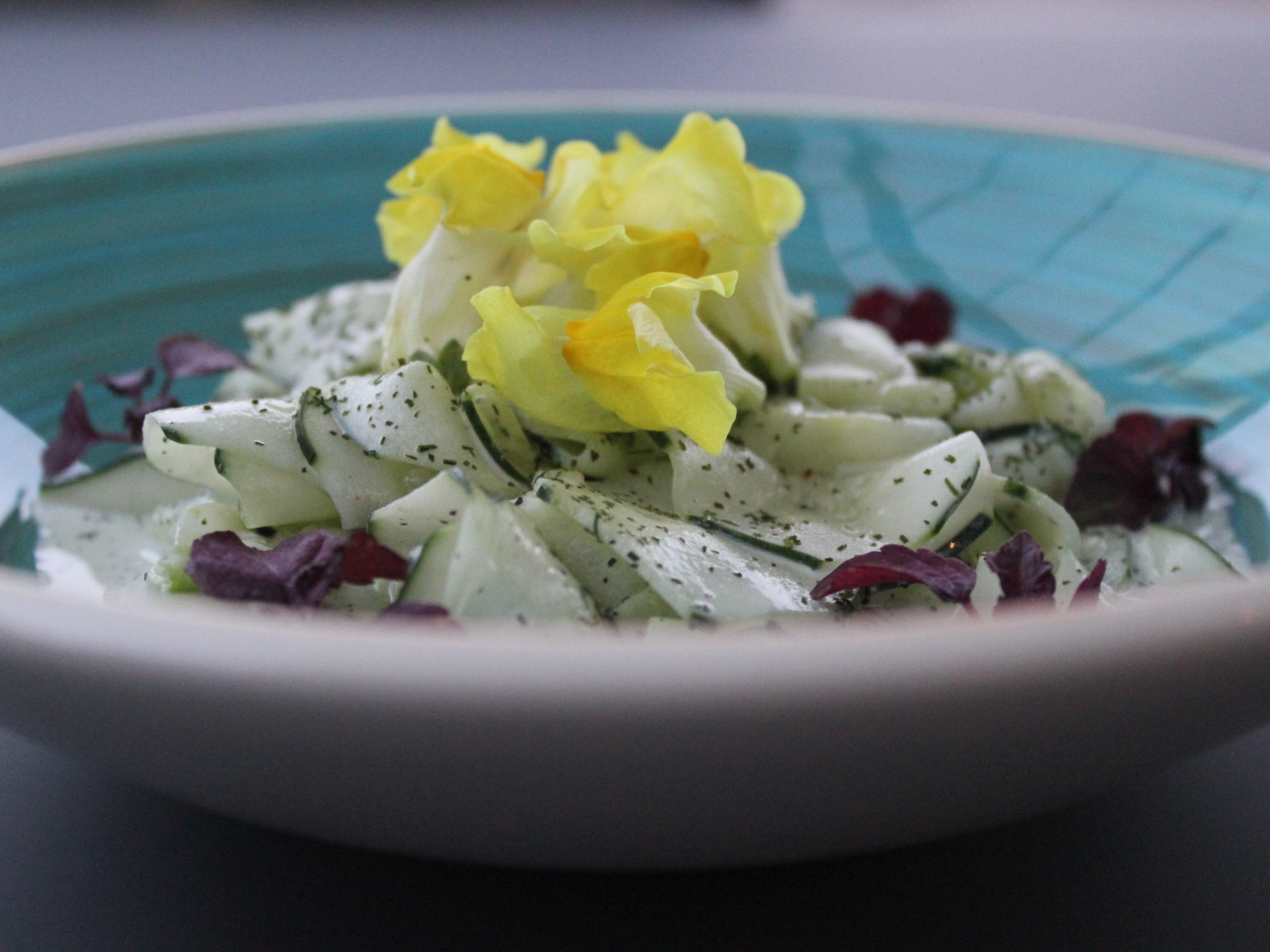Ons tuintje water geven tijdens deze droge periode geeft een overmaat aan komkommers. Tijd om er iets mee te doen. Een deel inmaken zoals de augurken en een deel met de mandoline snijden in deze salade en dan nog zoveel in de frigo voor een volgende bereiding.