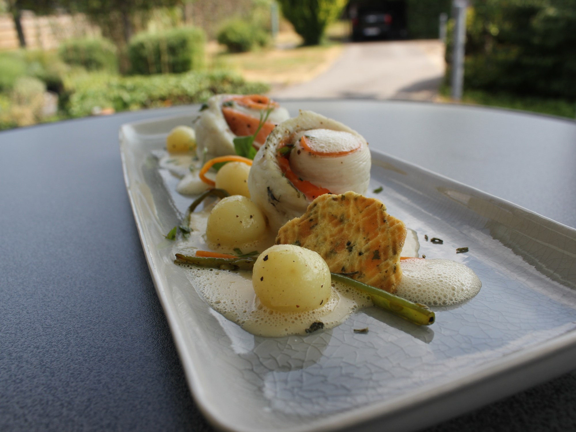 Scholrolletjes met gerookte zal met wortel en boontjes en prseccosaus