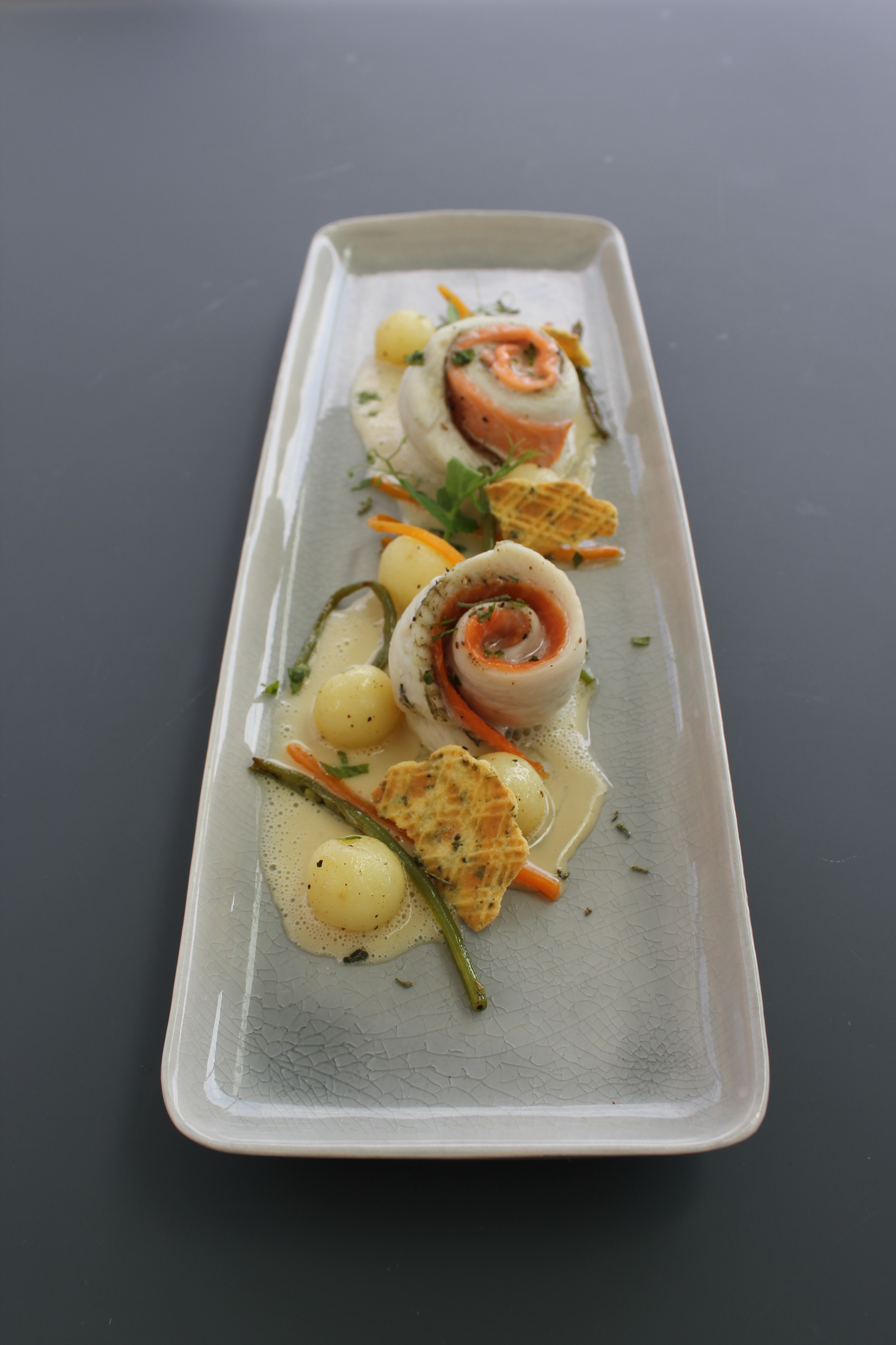 Scholrolletjes, zalm, proseccosaus