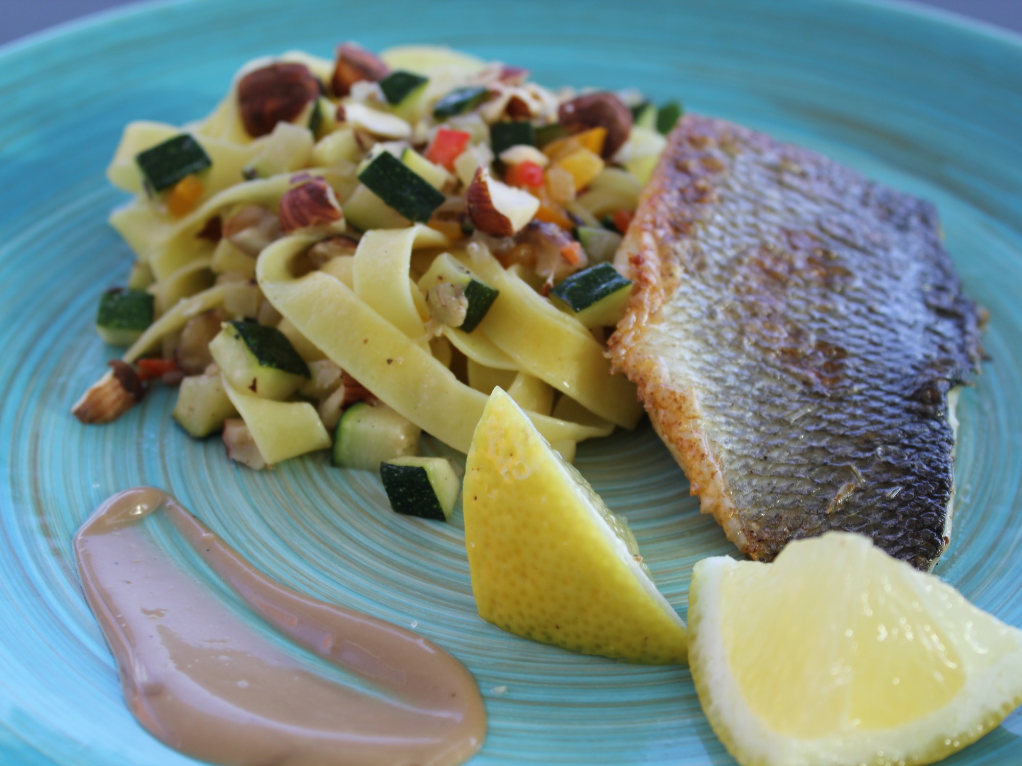 Fettuccine met zeebaars, courgette en hazelnoten met een balsamicocrème.