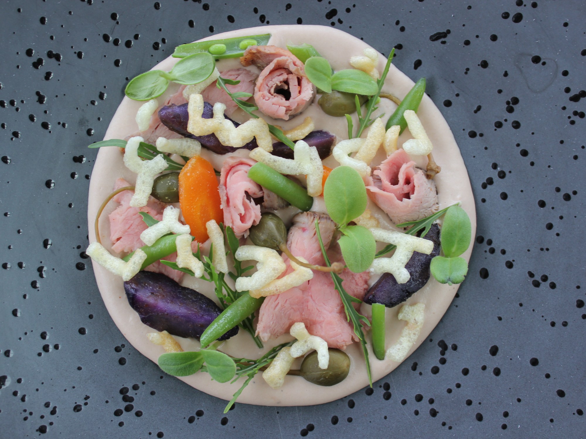 Blik tonijn op olie, yoghurt, kalfsribeye, kapperappeltjes, air bag aardappel granulaat, truffelaardappel, roomboter, rucola, beetje boontje en wortelen.