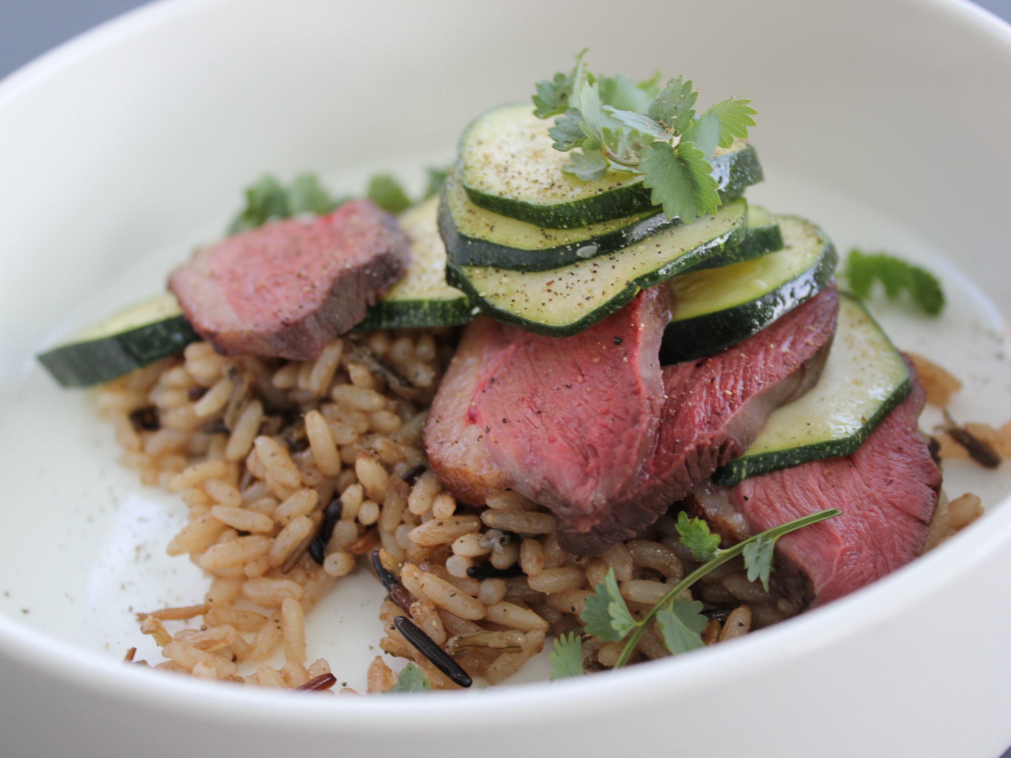 Salade van wilde rijst met op BGE gerookte eendenfilet met gemarineerde courgette