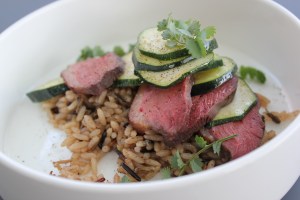Rijst, gerookte eend, courgette