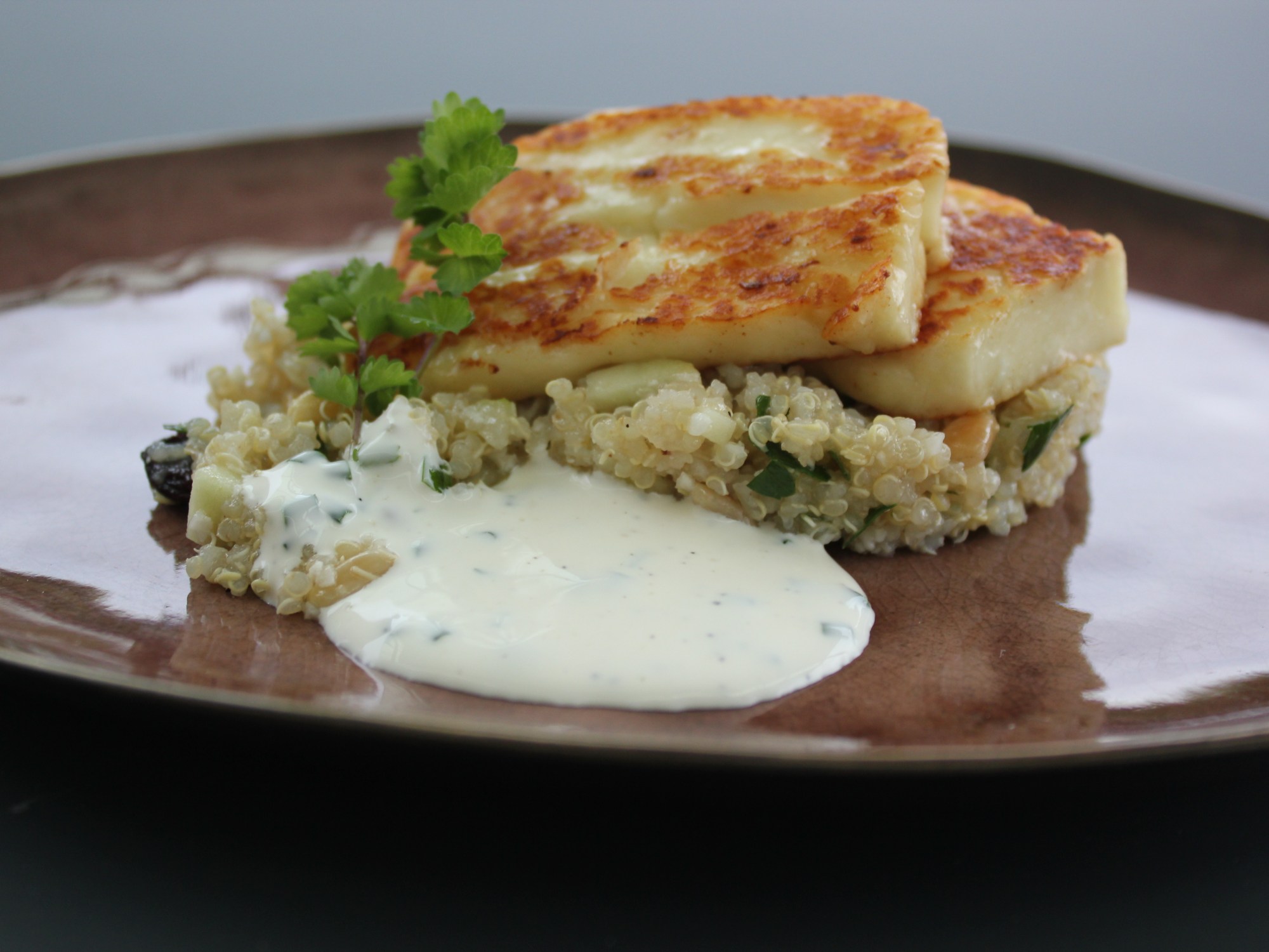 Berloumi en een salade van quinoa, geschaafde bloemkool, groene appel, rozijnen, selder, peterselie, witte balsamico-azijn, notenolie, druivenpitolie, pijnboompitten en een yoghurt-vinaigrette.