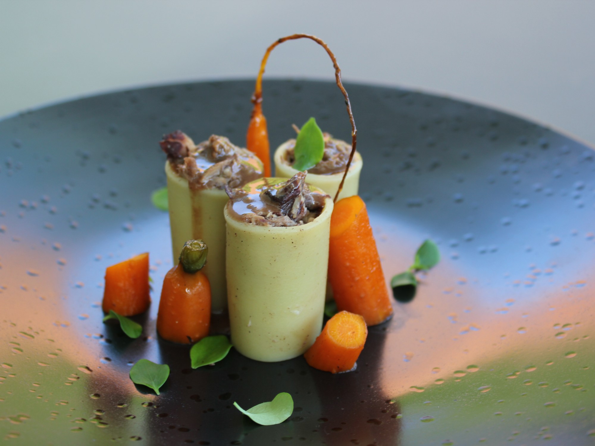 Paccherri met ragout van konijn en gekarameliseerde sous-vide gegaarde wortel