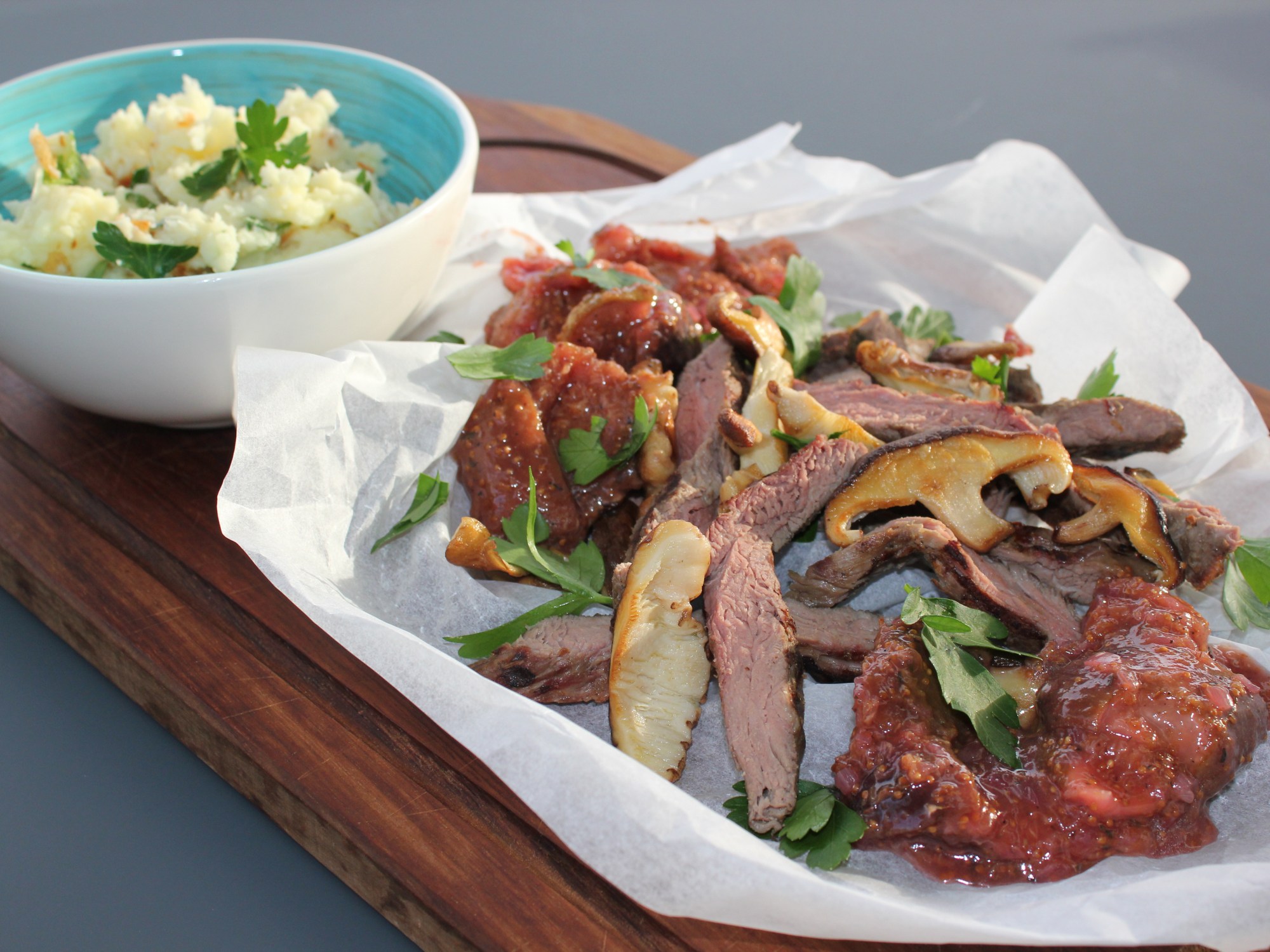 Sous-vide gegaarde bavette met vijgencompote, pastinaakpuree met gebakken ui en kervel.