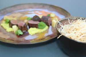Hazenrugfilet, appeltjes, jeneverbessensaus, kadayif