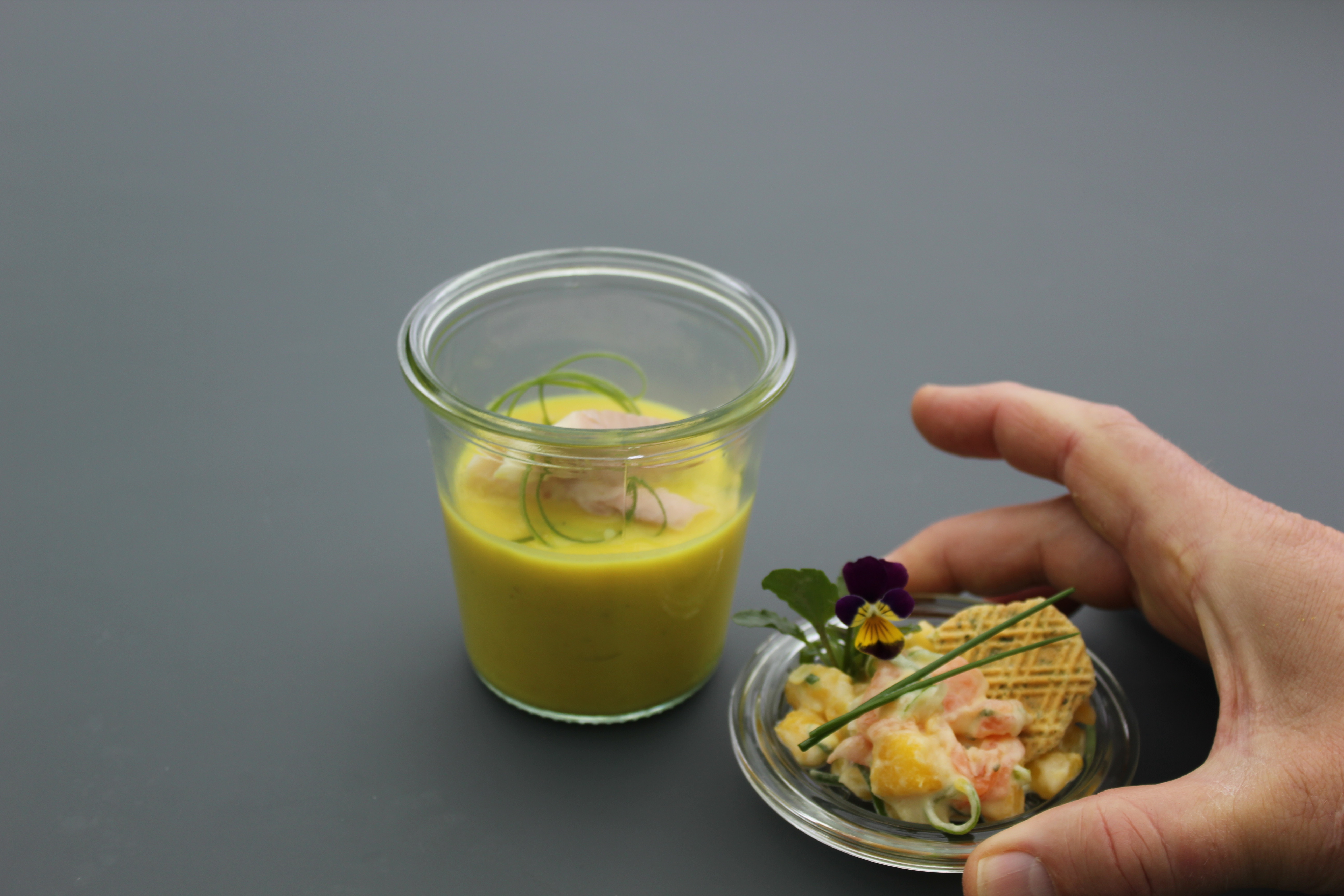 aardappelsoep, forel, zalm, mango