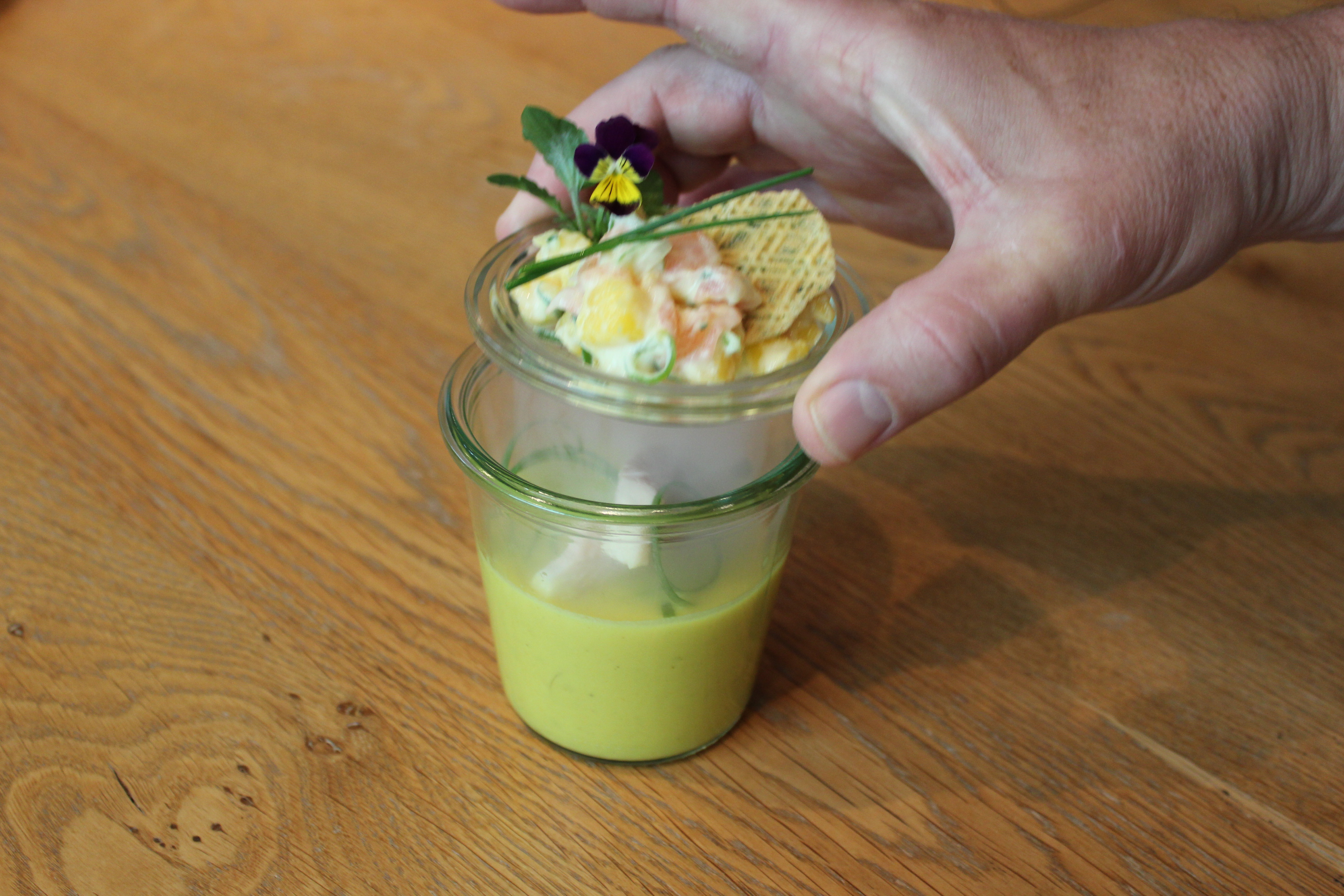 aardappelsoep, forel, zalm, mango