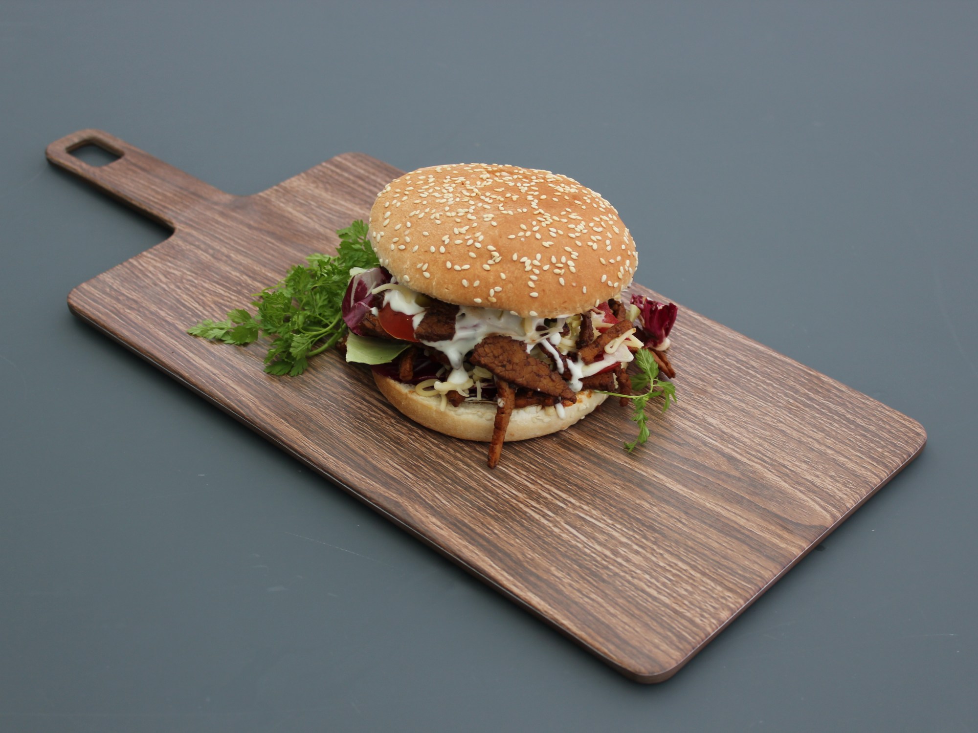 kalfsfilet, looksaus, mixed salade, kervel, lente-ui, geraspte kaas, burger-broodjes.