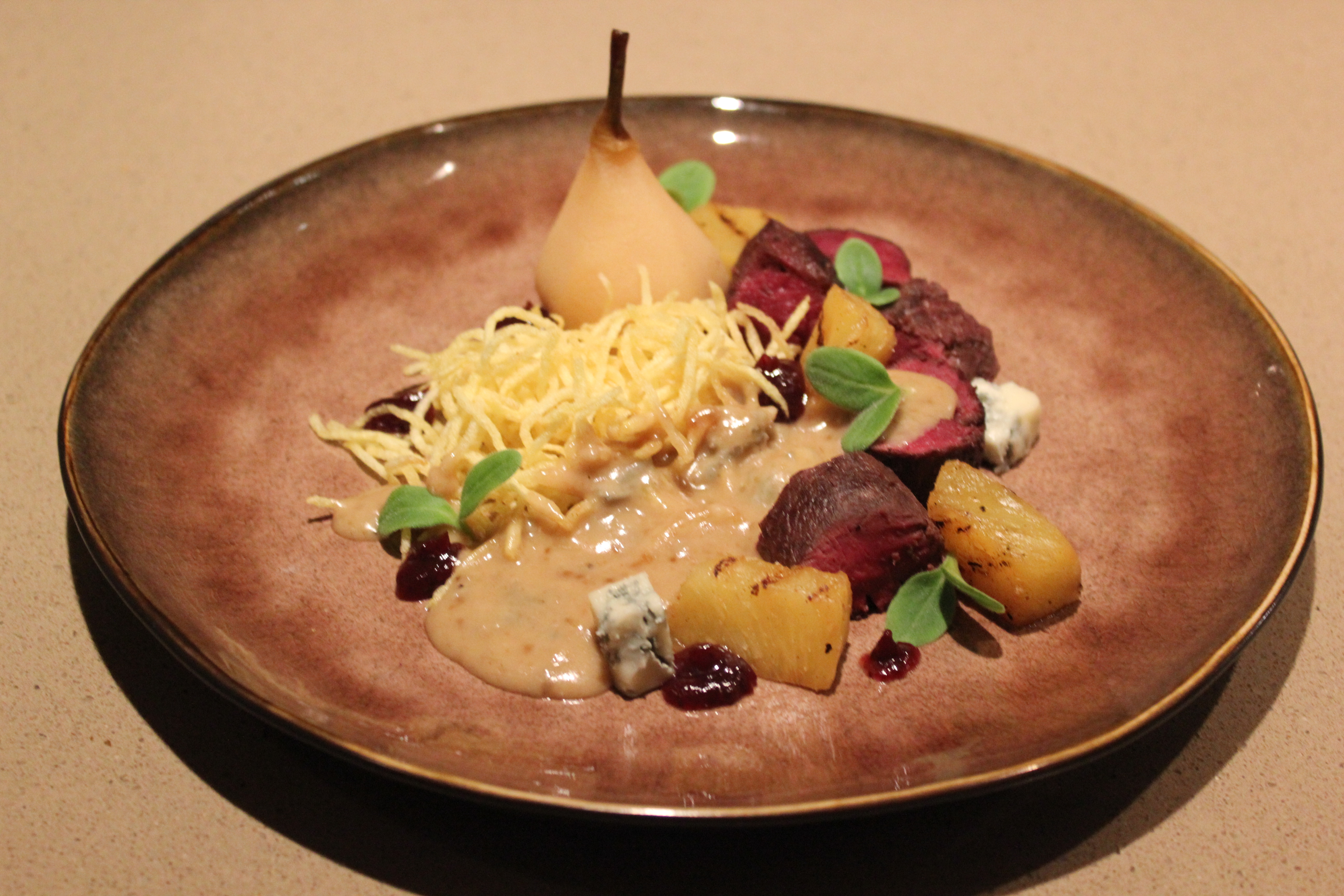 Hazenrugfilet, peer, ananas, gorgonzola, grasfrietjes