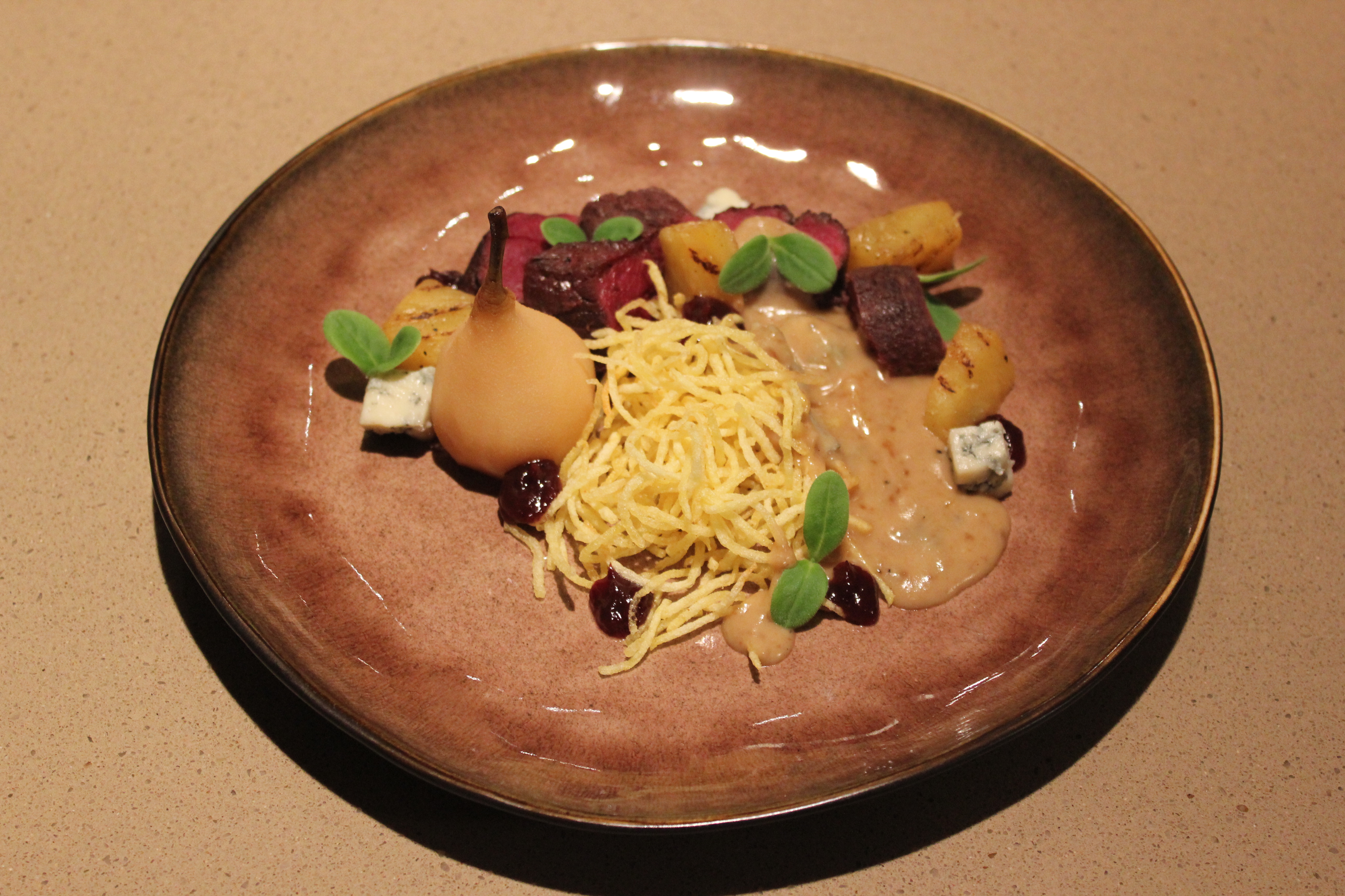Hazenrugfilet, peer, ananas, gorgonzola, grasfrietjes