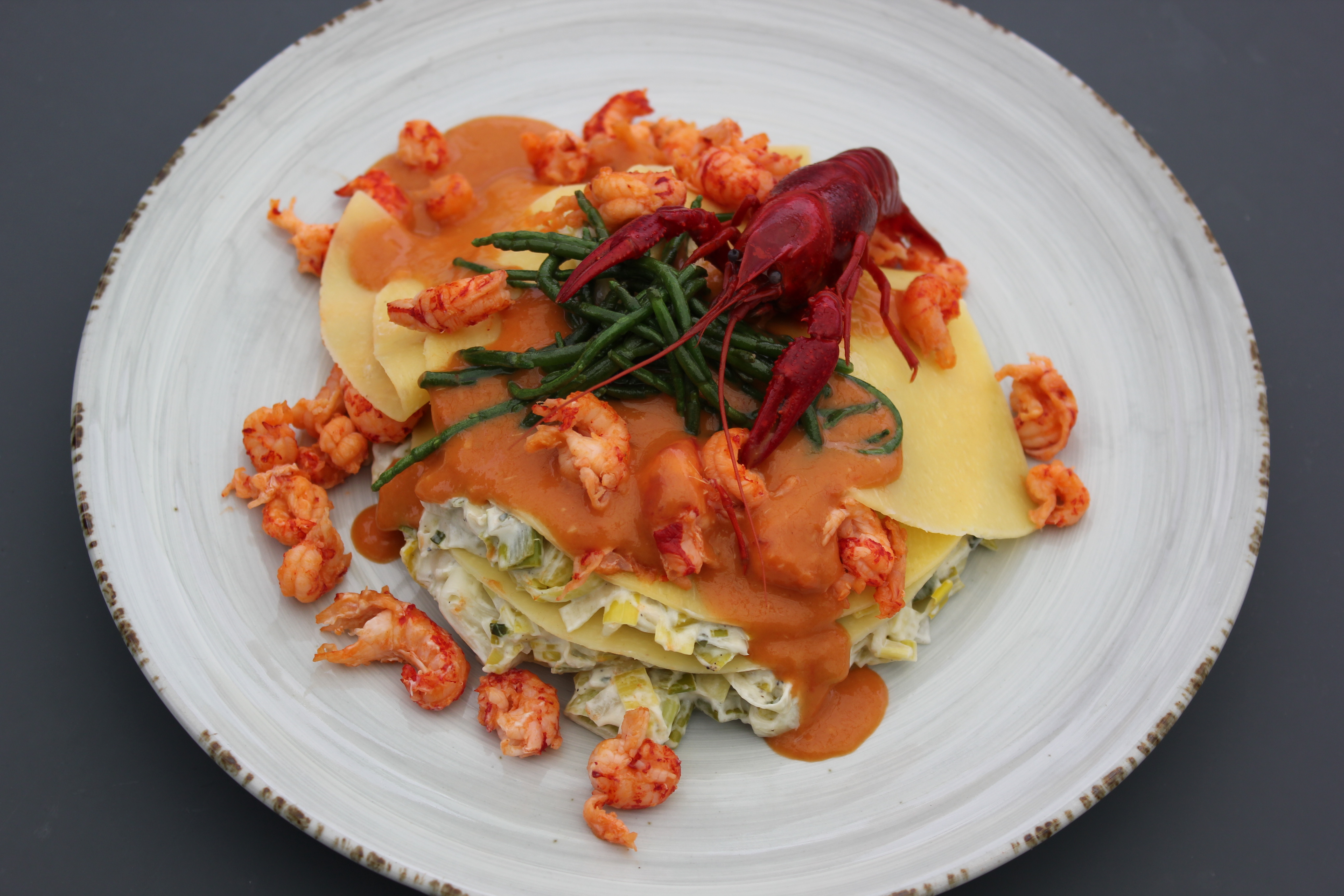 Lasagne, rivierkreeftjes, porei