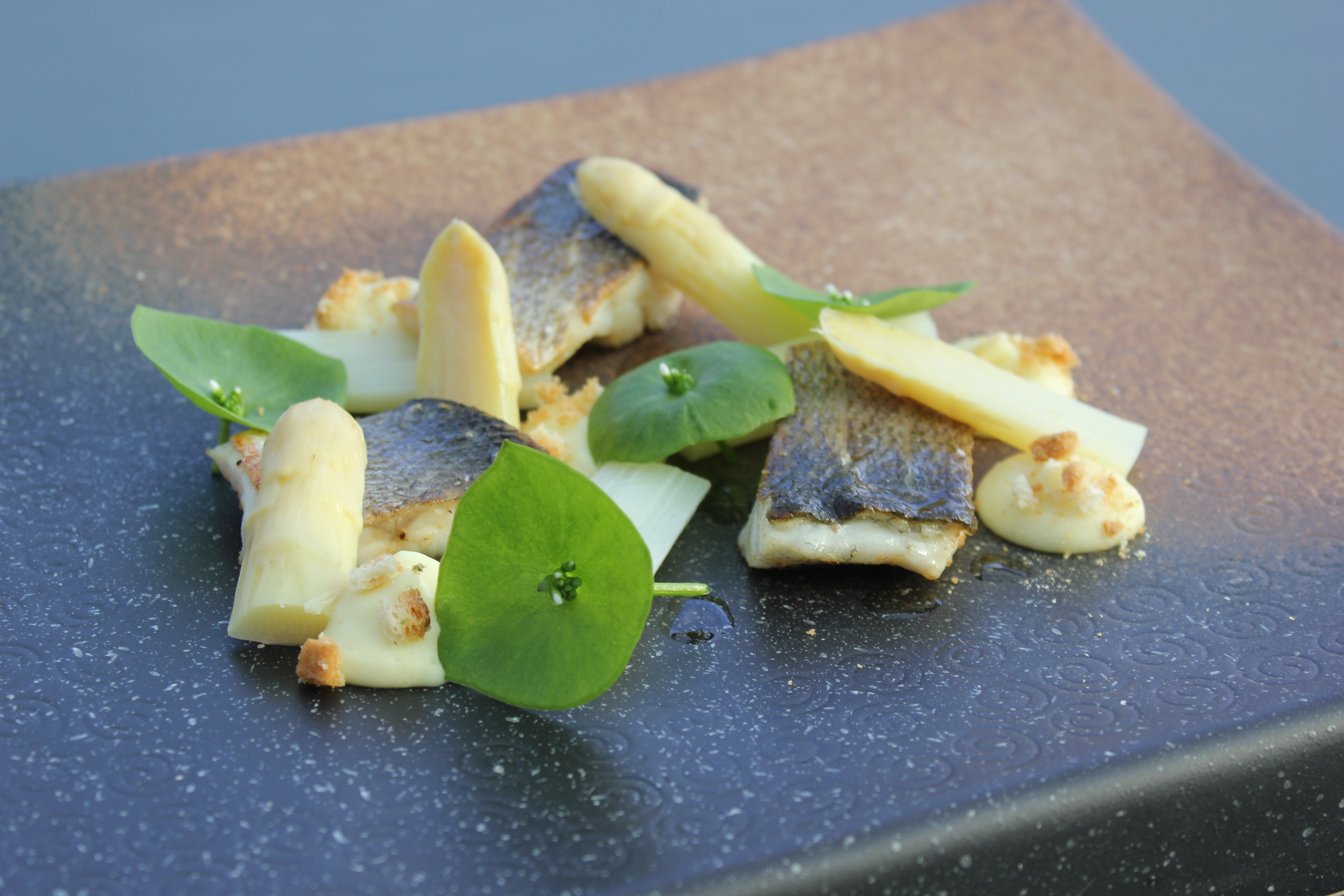 Zeebaars, asperges, aardappelcrème