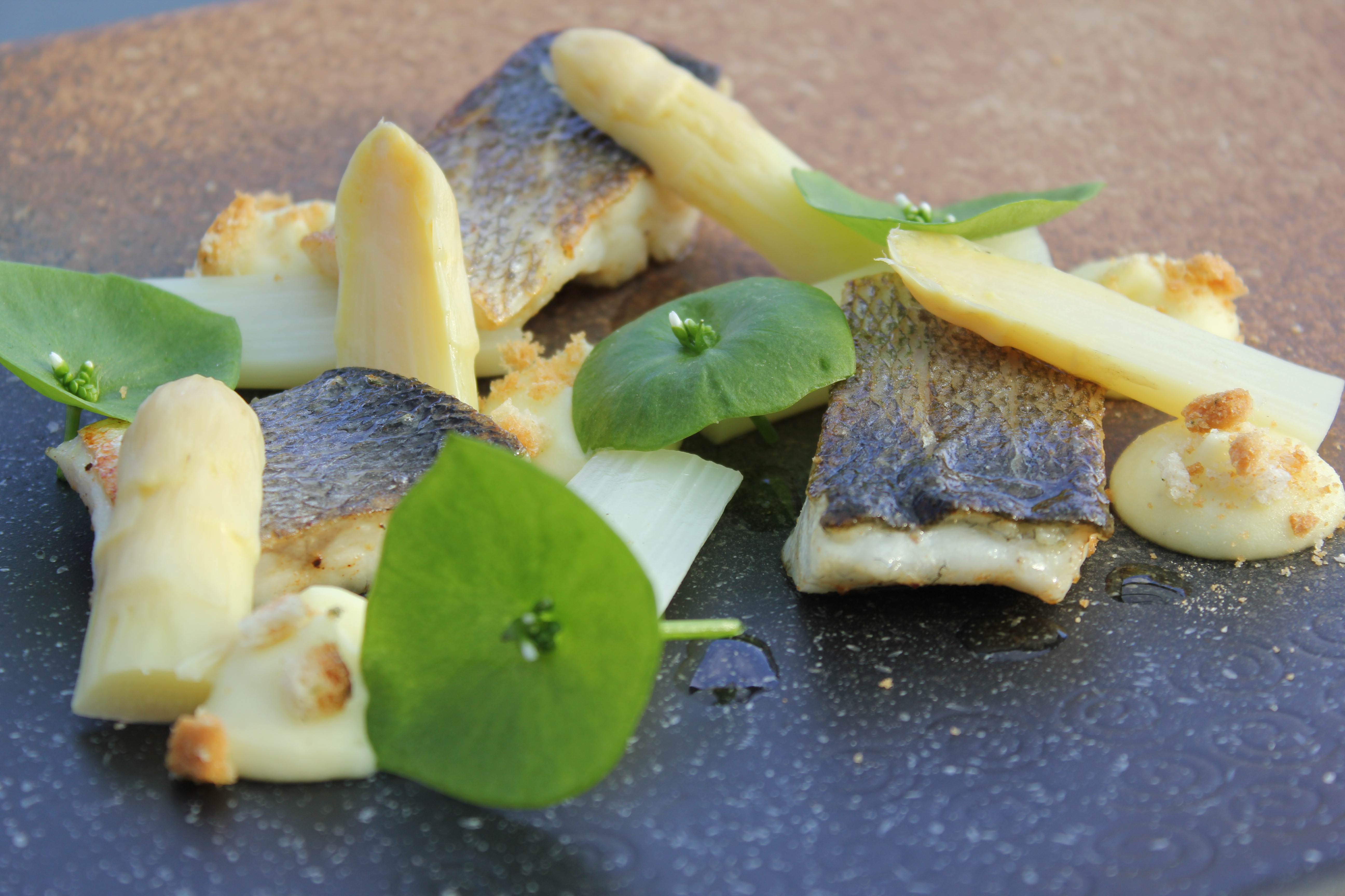 Zeebaars, asperges, aardappelcrème