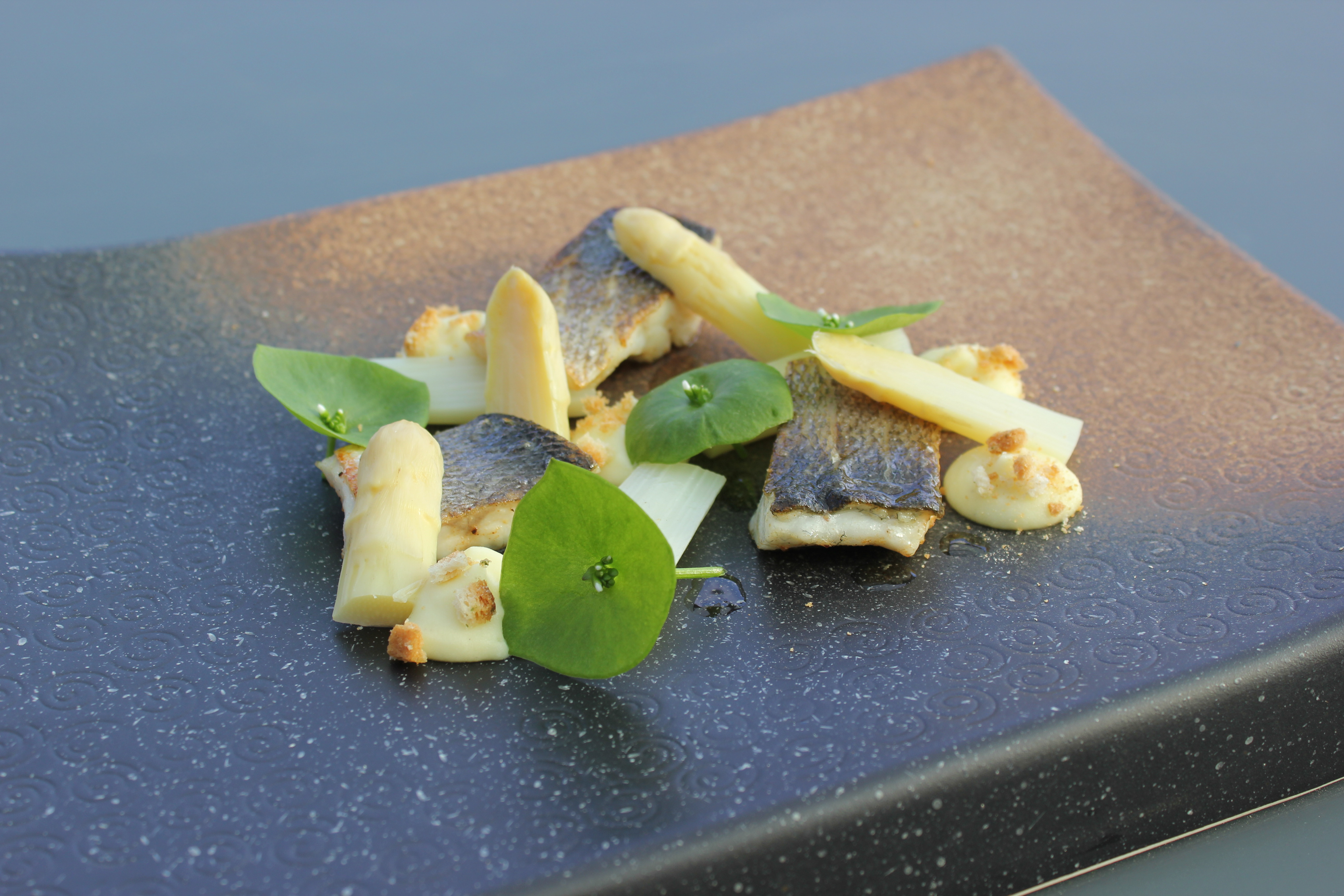 Zeebaars, asperges, aardappelcrème