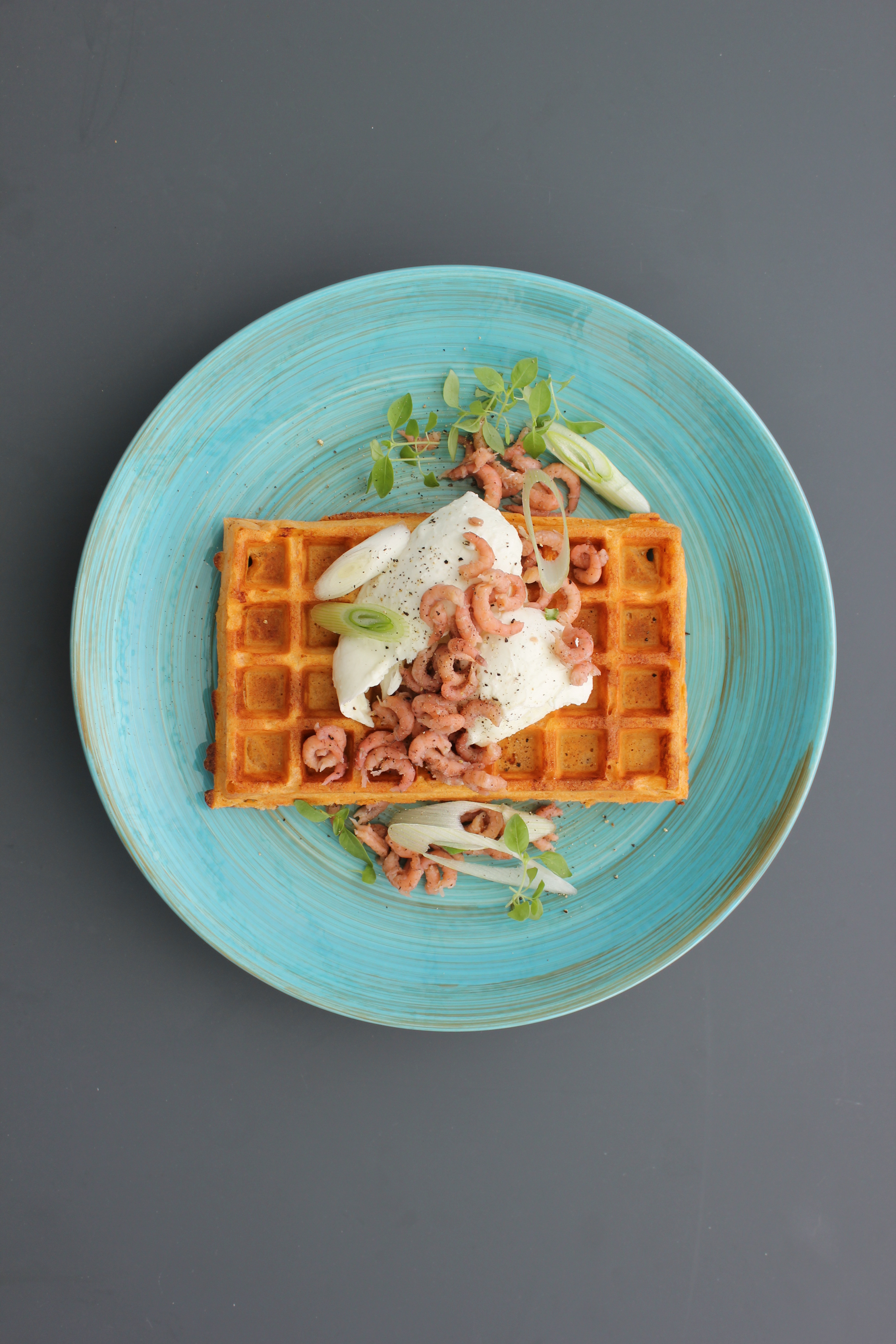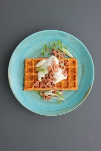 Wafel, pesto, mozzarella, grijze garnalen