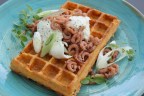 Wafel, pesto, mozzarella, grijze garnalen