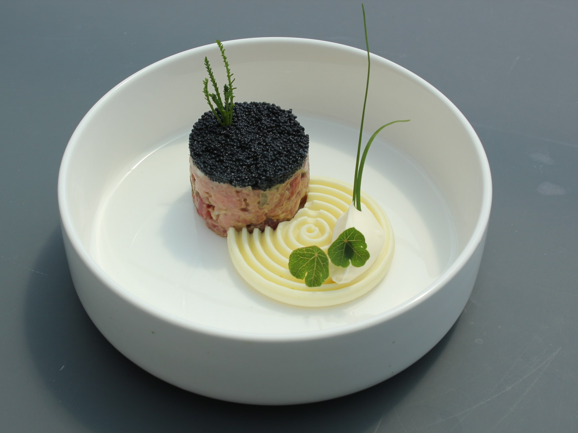 Rundstartaar | asperge-aardappelmousseline | zure room | “Caviart”