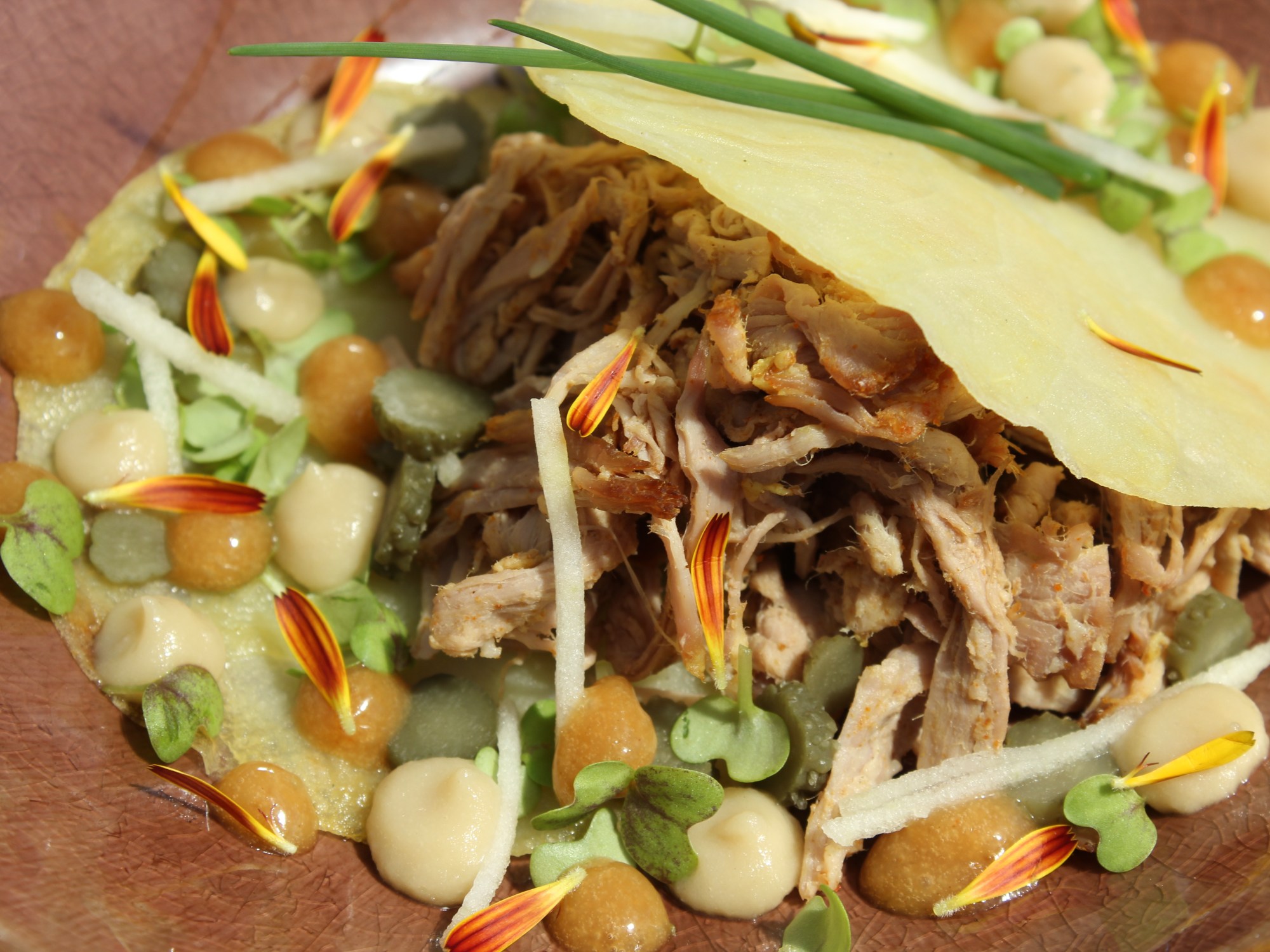 Pulled pork | espuma van gekarameliseerde ui | mosterd cress | pulled pork dressing | gebakken aardappelschijfjes