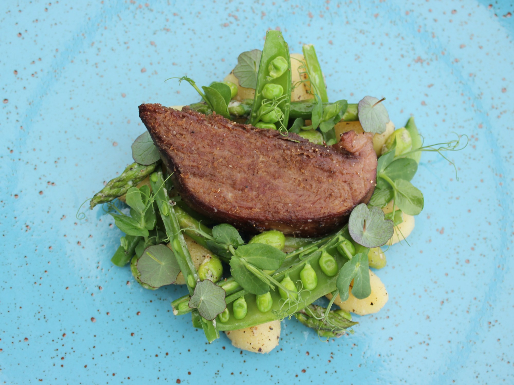 Sous-vide gegaarde lamsbout | truffel gnocchi | boontjes | groene asperges | erwtjes | tuinbonen | zure room
