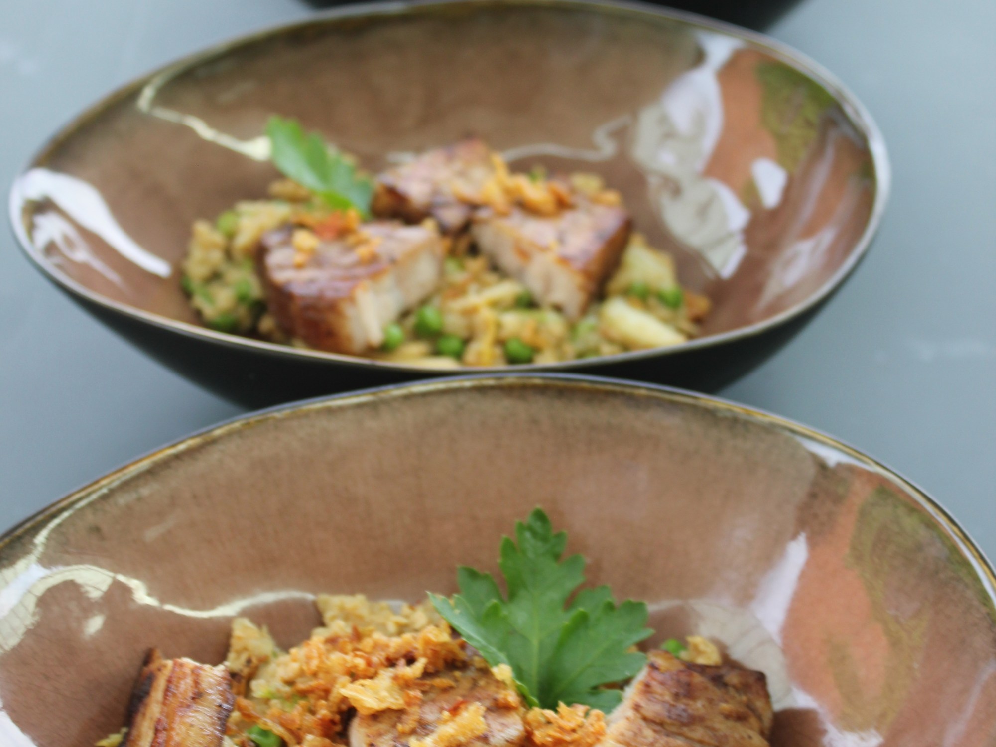 gelakt buikspek met nasi goreng: buikspek 100 gr/persoon sous vide in de marinade voor 24 uren op 68°C. Nasi bereid zoals in link. Opgepast, de Chinese kool pas voor opdienen eronder roeren. Finaal ook nog Ketjap Manis eronder roeren. Krokante uitjes en koriander niet vergeten.