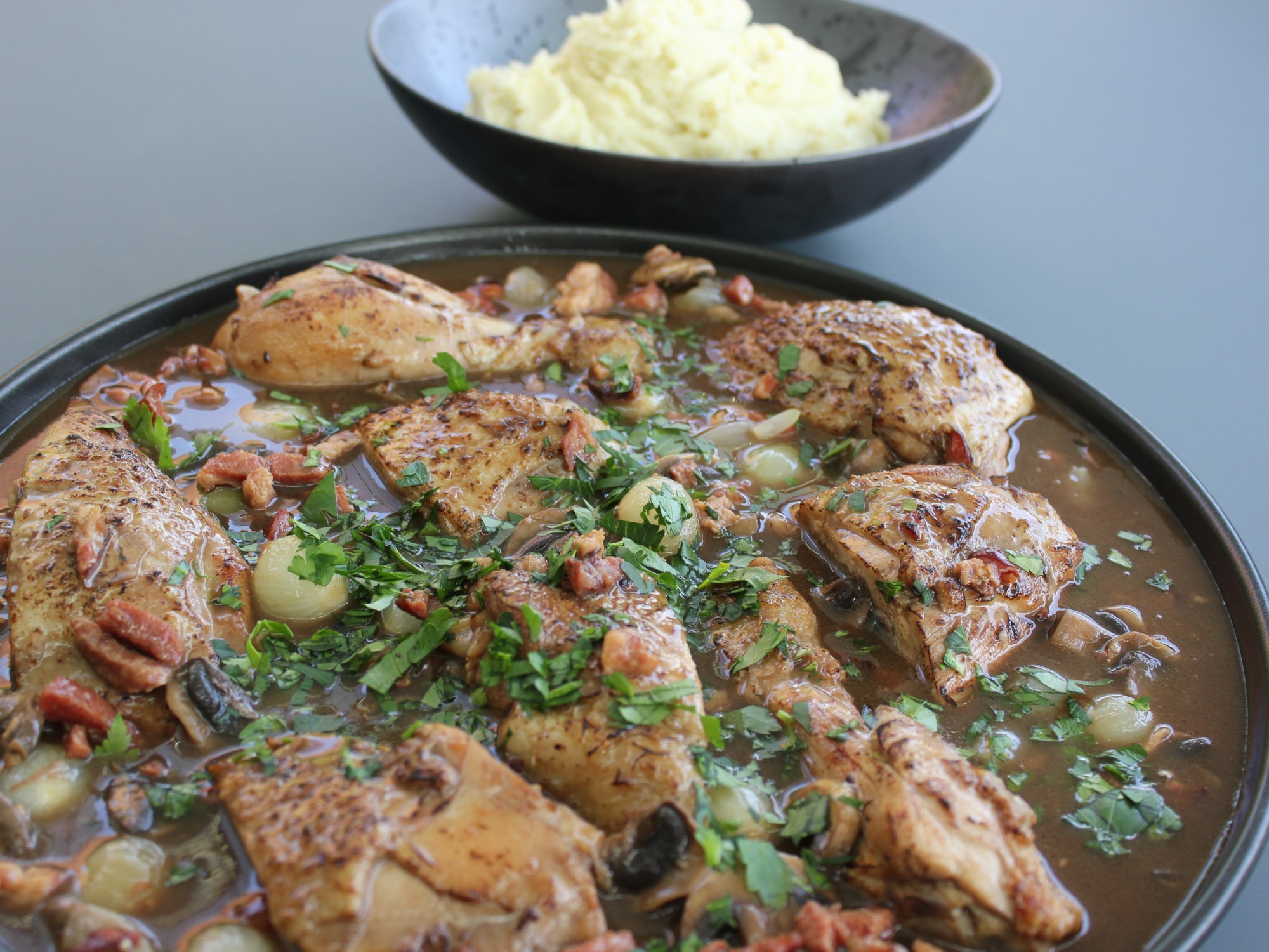 Coq au vin | rode wijn-portsaus | zilveruitjes | champignons | spek | peterselie | puree met kruidenzout