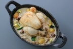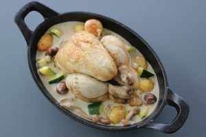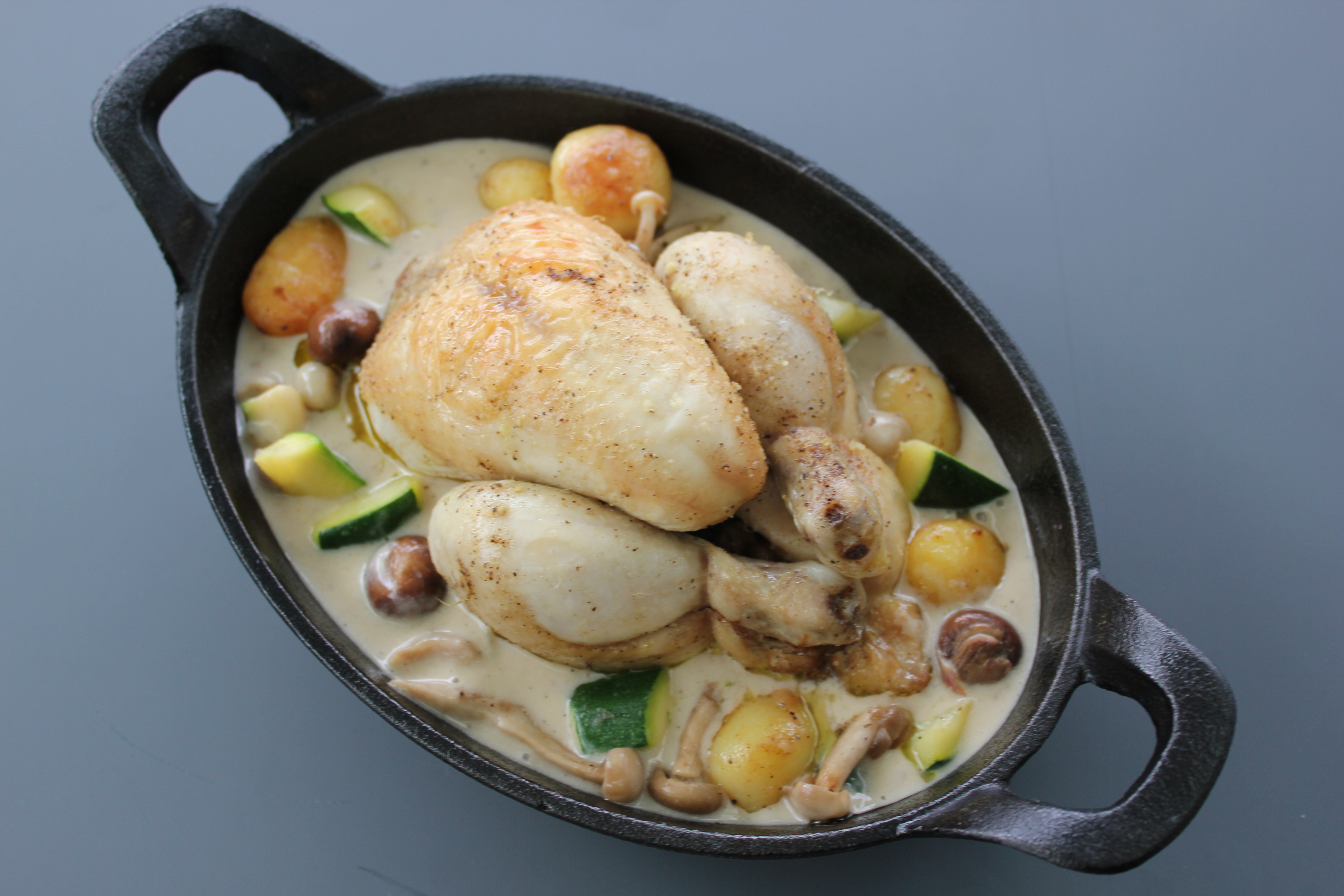 Piepkuiken, champignonsaus, courgette