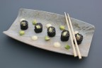 Sushi, avocado, fregola, pulled mushrooms